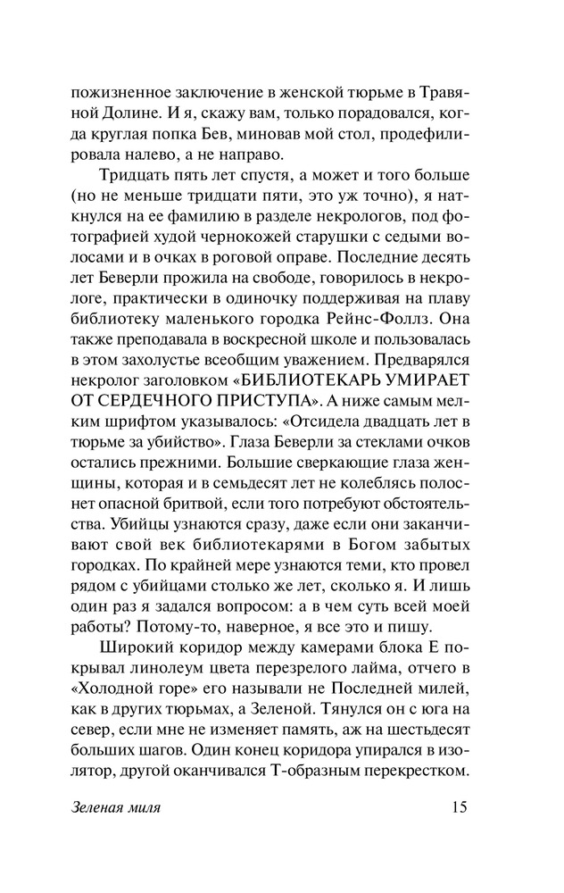 Стивен Кинг приглашает читателей в жуткий мир тюремного блока смертников, откуда уходят, чтобы не вернуться, приоткрывает дверь последнего пристанища тех, кто преступил закон и теперь отсчитывает последние часы...