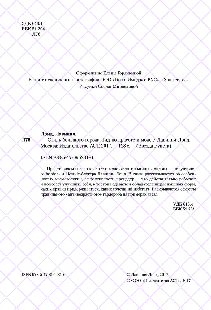 Стиль большого города. Гид по красоте и модеВ данный момент этот товар отсутствует в продаже. Возможно, у нас найдется аналогичный или похожий товар здесь. Серия: Звезда Рунета Представляем гид по красоте и моде от жительницы Лондона — популярного fashion- и lifestyle-блогера Лавинии Лонд. В книге рассказывается об особенностях косметологии, эффективности процедур — что действительно работает и помогает улучшить себя, как стоит одеваться обладательницам пышных форм, каких правил придерживаться, каких сочетаний избегать. Раскрываются секреты правильного «антивозрастного» гардероба на примерах звезд. |