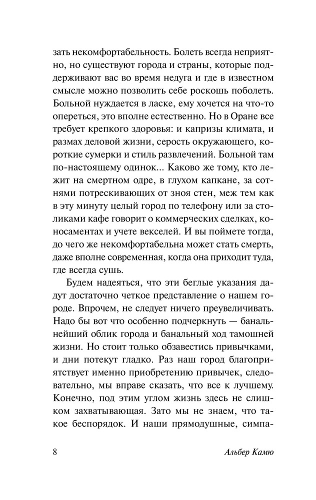 Уже после первого прочтения «Чума» была отправлена на полку с любимой литературой. Не Кьеркегор, Ницше…и даже не Сартр(спорно), увлекли философией экзистенциализма, именно Камю. Сначала был Камю. И на работы Фёдора Михайловича это дало возможность посмотреть под иным углом. Прекрасная художественная литература, философского толка. Ошибочно мнение, что все эти люди лишь страдальцы и минором Вас поливают нещадно. С ними есть о чём поспорить и чего позаимствовать.(как минимум способность мыслить рационально) Хотя, «воробушками» быть, тем кто их осуждает, - тоже никто не запретит. Я бы предложил человеку впервые открывшему Камю с Сартром, читать неторопливо, вдумчиво…и не проецировать бубонную чуму у Камю с вирусом 2020 года. Объект здесь скорее, - Раймон, Бернар, Жан и другие…все они, главные герои. Чума – это часть жизни. Никуда она не исчезает, как и выбор, который ежедневно Вы совершаете в той или иной жизненной ситуации.