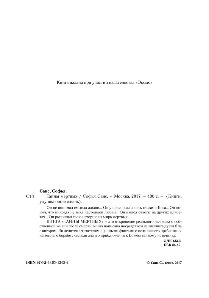 Тайны мертвыхВ данный момент этот товар отсутствует в продаже. Возможно, у нас найдется аналогичный или похожий товар здесь. Серия: BTL проекты Он не понимал смысла жизни... Он увидел реальность глазами Бога... Он понял, что никогда не знал настоящей любви... Он нашел ответы на других планетах... Он рассказал свою историю из мира мертвых...КНИГА «Тайны мёртвых» — это откровение реального человека о собственной жизни после смерти: книга написана посредством ченнелинга души Яна с автором. Ян делится с читателями ценными фактами о цели нашего пребывания на земле, о борьбе с силами зла и о приближении к Божественному источнику. |