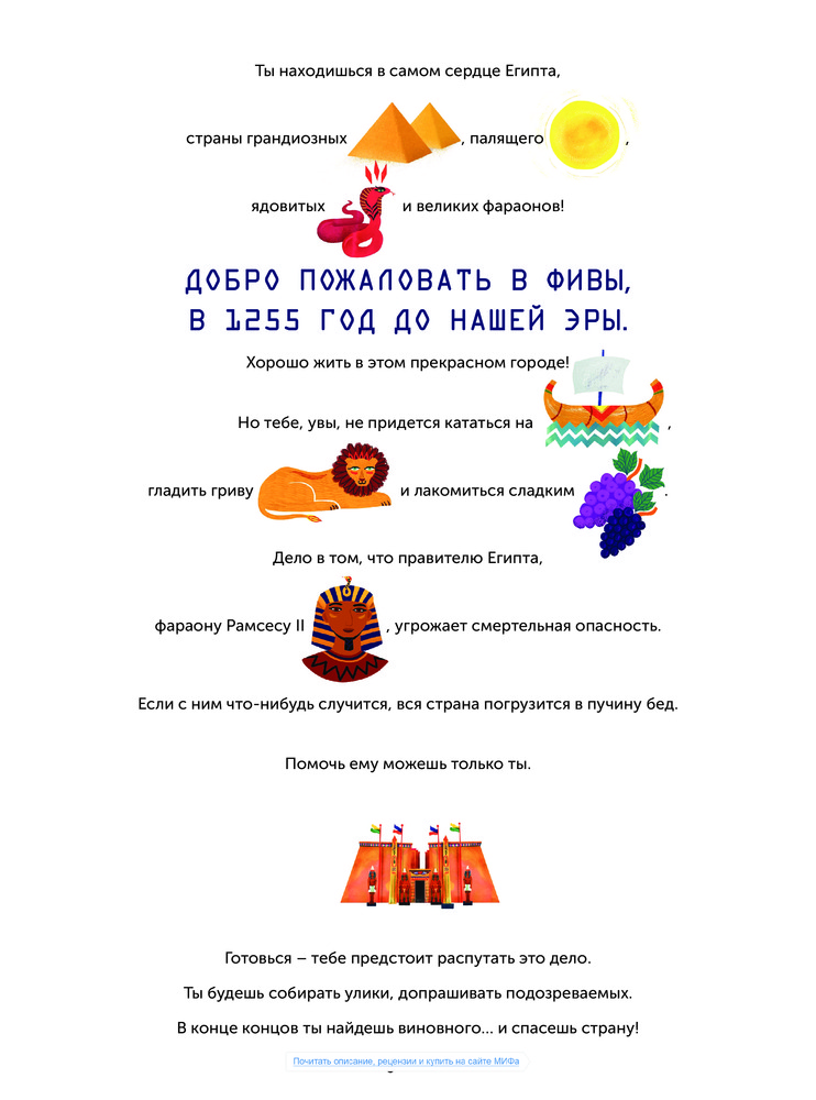 Переполох в Египте. Кто готовит заговор?Камиль Готье, Стефани Верне, Марго Карпантье В данный момент этот товар отсутствует в продаже. Возможно, у нас найдется аналогичный или похожий товар здесь. Серия: МИФ. Детство Познавательная книга и квест — благодаря искусному сочетанию этих двух жанров юный читатель оказывается в эпицентре не вымышленных, а реальных событий. Верный способ заинтриговать даже тех, кто не увлекается историей! |