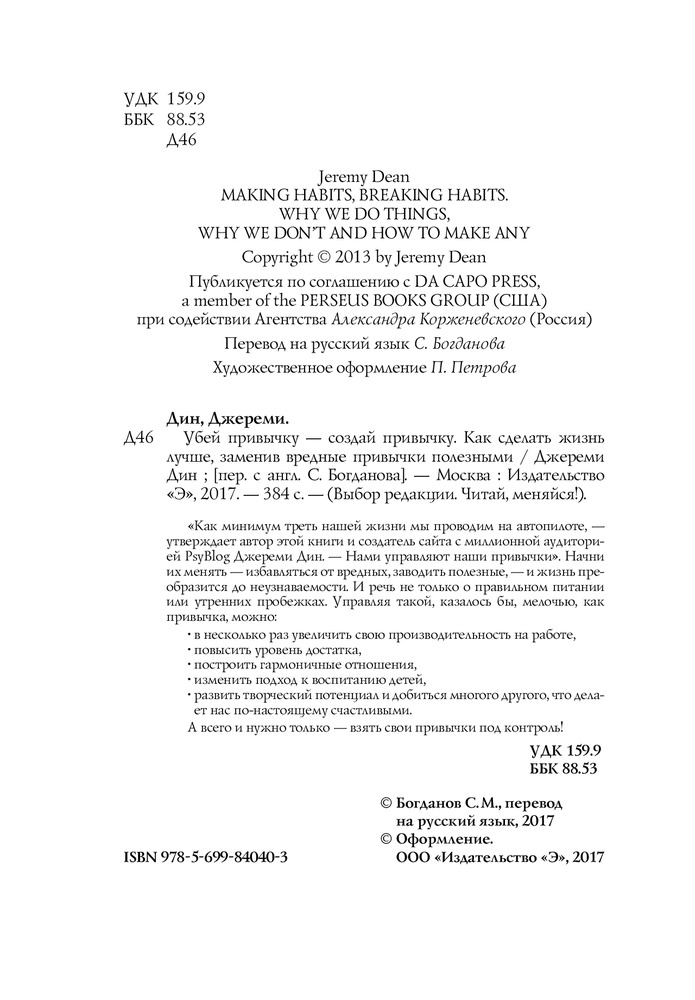 Убей привычку - создай привычку. Как сделать жизнь лучше, заменив вредные привычки полезнымиВ данный момент этот товар отсутствует в продаже. Возможно, у нас найдется аналогичный или похожий товар здесь. Серия: Выбор редакции. Читай, меняйся! "Как минимум треть нашей жизни мы проводим на автопилоте, — ?утверждает автор этой книги и создатель сайта с миллионной аудиторией PsyBlog Джереми Дин. — ?Нами управляют наши привычки". Начни их менять — ?избавляться от вредных, заводить полезные, — ?и жизнь преобразится до неузнаваемости. И речь не только о правильном питании или утренних пробежках. Управляя такой, казалось бы, мелочью, как привычка, можно: |
