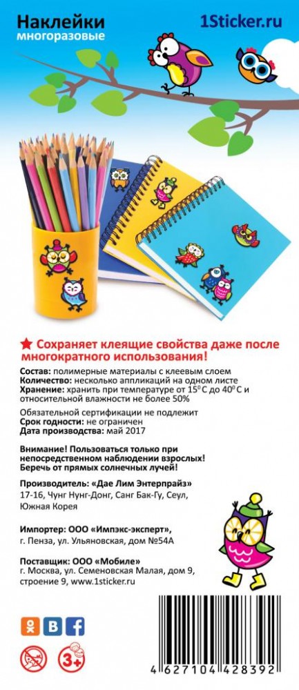 На блистере преставлен 21 стикер с совами: сонные, веселые, любопытные совята- порадут и обестечат хорошим настроением всех деишек! Наклейки сделаны из мягкого винила, безопасного для здоровья детей. Они отличаются высоким качеством изображения и цветопередачи. Яркие стикеры добавят привычным вещам оригинальности: они легко крепятся к телефону, ноутбуку, холодильнику или зеркалу. Специальная клеевая основа делает возможным многоразовое использование наклеек и не оставляет следов на поверхности. Наклейки пригодятся рукодельникам: украсьте ими открытки, альбомы, фоторамки или создайте коллаж.