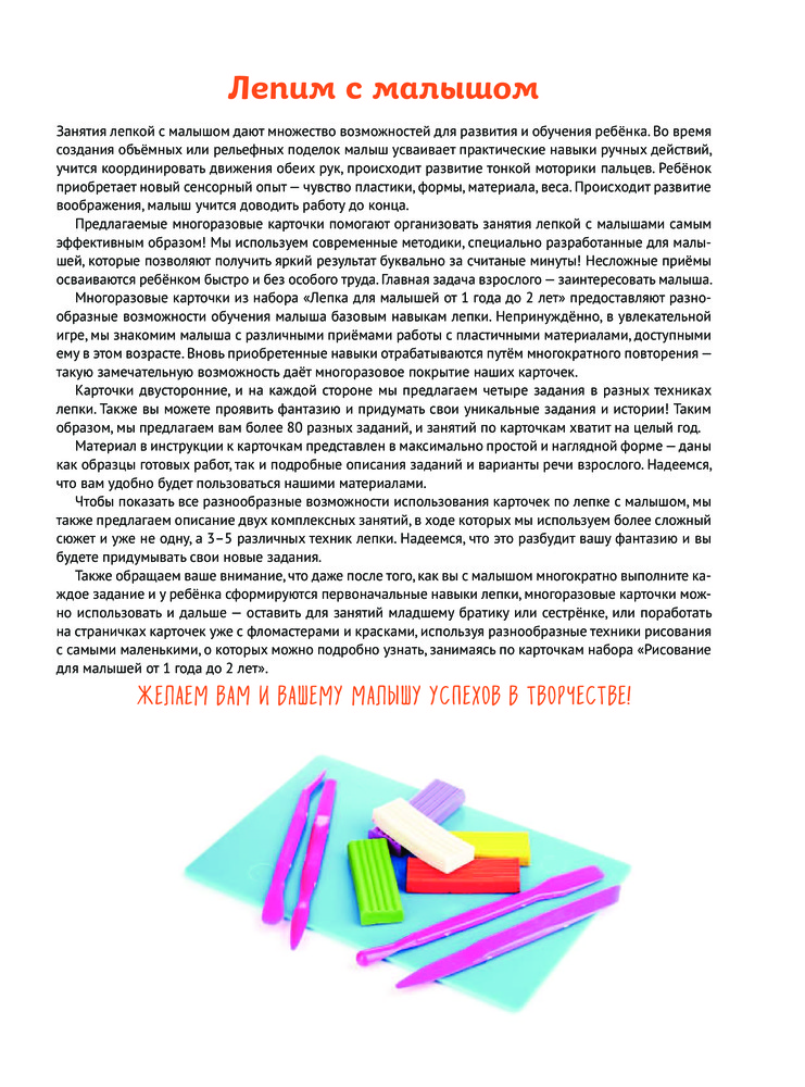 Многоразовые развивающие карточки. Лепка для малышей от 1 года до 2 летВ данный момент этот товар отсутствует в продаже. Возможно, у нас найдется аналогичный или похожий товар здесь. Серия: Авторская методика Елены Янушко Ваш малыш хочет лепить, но пока не умеет этого делать? |