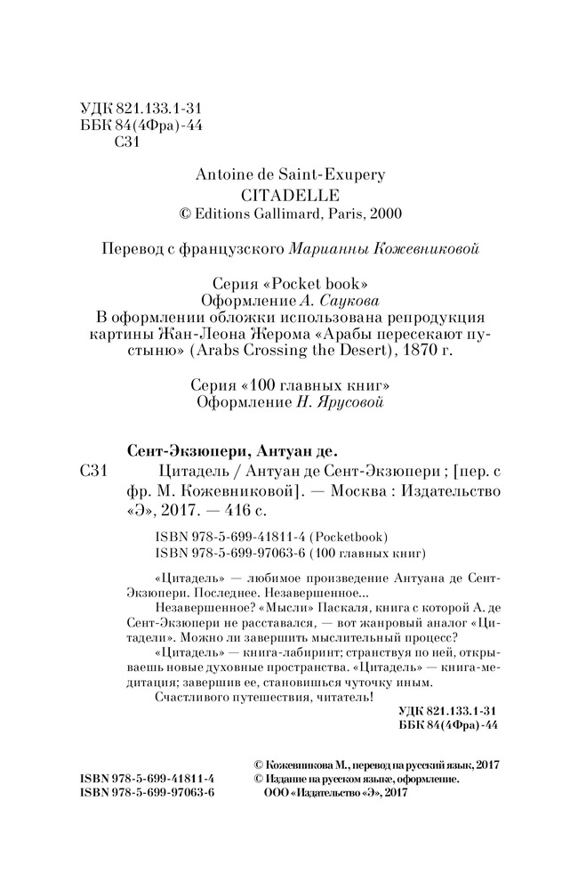 ЦитадельВ данный момент этот товар отсутствует в продаже. Возможно, у нас найдется аналогичный или похожий товар здесь. Серия: 100 главных книг (обложка) «Цитадель» — любимое произведение Антуана де Сент-Экзюпери. Последнее. Незавершенное... |