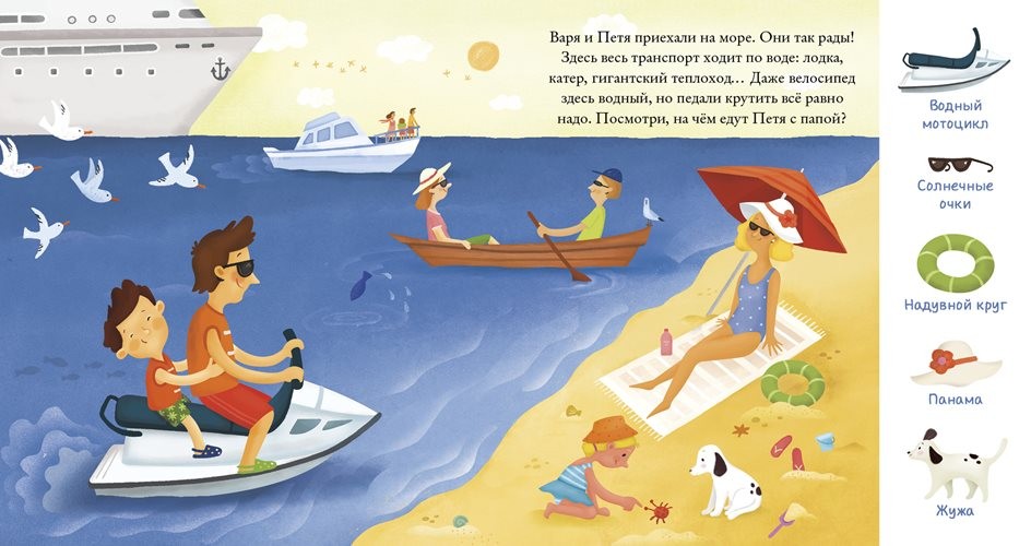 Найди и покажи, малыш. Транспорттвёрдый переплёт глянцевая бумага красочные иллюстрации стимулирует речь подходит для малышей В данный момент этот товар отсутствует в продаже. Возможно, у нас найдется аналогичный или похожий товар здесь. Серия: Найди и покажи Петя и Варя приехали на море! Они так рады! Здесь весь транспорт ходит по воде: лодка, катер, гигантский теплоход. Даже велосипед здесь водный, но педали крутить все равно надо. В этой замечательной книжке красочные иллюстрации с крупными элементами, коротким и доступным текстом — все для того, чтобы кроха с удовольствием учился. Рассматривайте вместе картинки, ищите предметы, вынесенные на край страницы, а шустрая собачка Жужа не даст заскучать, она будет сопровождать вас на протяжении всего путешествия. Книжку приятно брать в руки: странички плотные, а иллюстрации красочные и яркие. |