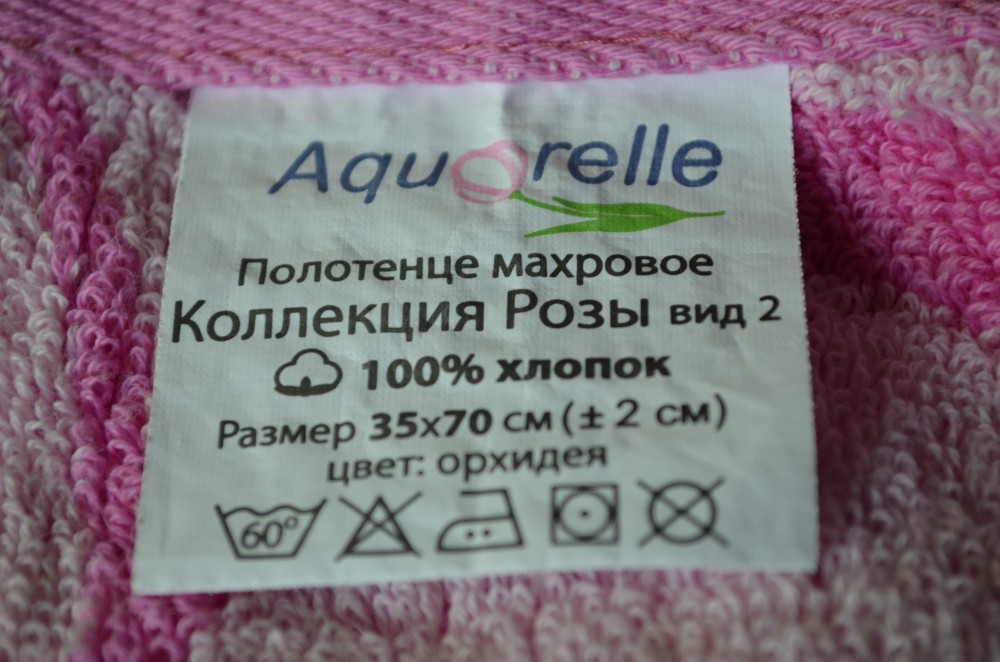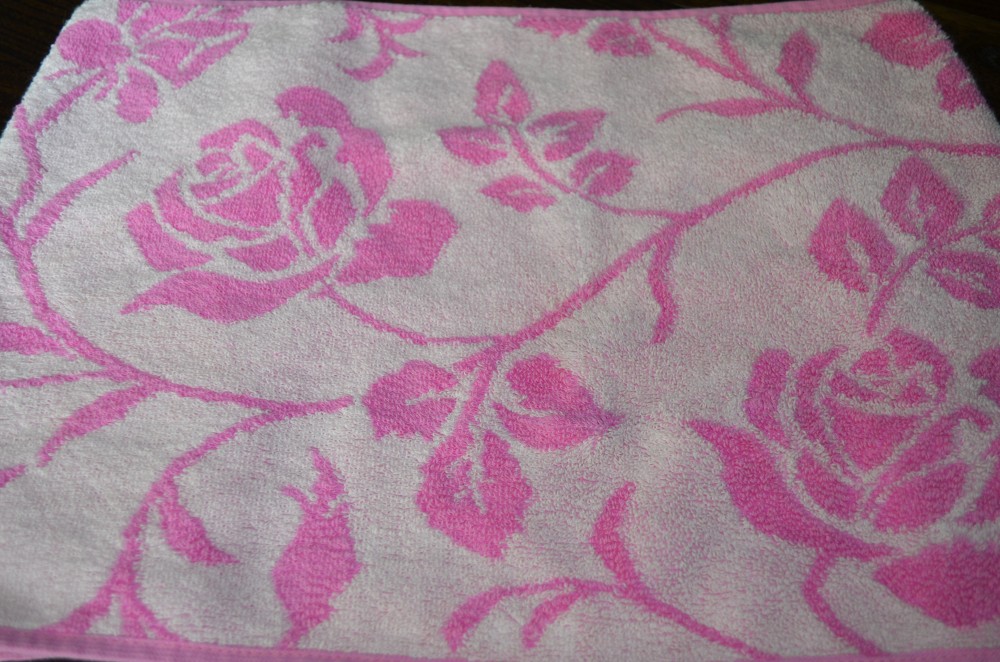 По цвету полотенце розовее,чем на фото,рисунок такой же.По началу, впитывало влагу не очень хорошо,но после пяти стирок впитываемость улучшилась.