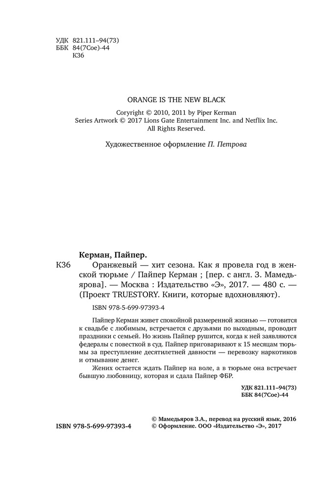 Оранжевый - хит сезона. Как я провела год в женской тюрьмеВ данный момент этот товар отсутствует в продаже. Возможно, у нас найдется аналогичный или похожий товар здесь. Серия: Проект TRUE STORY. Книги, которые вдохновляют Пайпер Керман живет спокойной размеренной жизнью — готовится к свадьбе с любимым, встречается с друзьями по выходным, проводит праздники с семьей. Но жизнь Пайпер рушится, когда к ней заявляются федералы с повесткой в суд. Пайпер приговаривают к 15 месяцам тюрьмы за преступление десятилетней давности — перевозку наркотиков и отмывание денег. Жених остается ждать Пайпер на воле, а в тюрьме она встречает бывшую любовницу, которая и сдала Пайпер ФБР. |