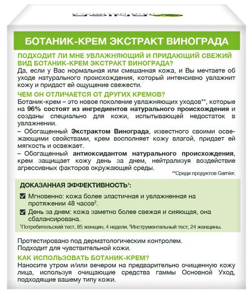 Garnier Крем-ботаник для лица увлажняющий «Экстракт винограда»В данный момент этот товар отсутствует в продаже. Возможно, у нас найдется аналогичный или похожий товар здесь. Серия: Основной Уход Ботаник-крем – это новое поколение увлажняющих уходов, которые на 96% состоят из ингредиентов натурального происхождения и созданы специально для кожи, испытывающей недостаток в увлажнении. Обогащенный экстрактом винограда, известного своими освежающими свойствами, крем восполняет кожу влагой, придает ей мягкость и освежает. Обогащенный антиоксидантом натурального происхождения, крем защищает кожу день за днем, нейтрализуя воздействие агрессивных факторов окружающей среды. |