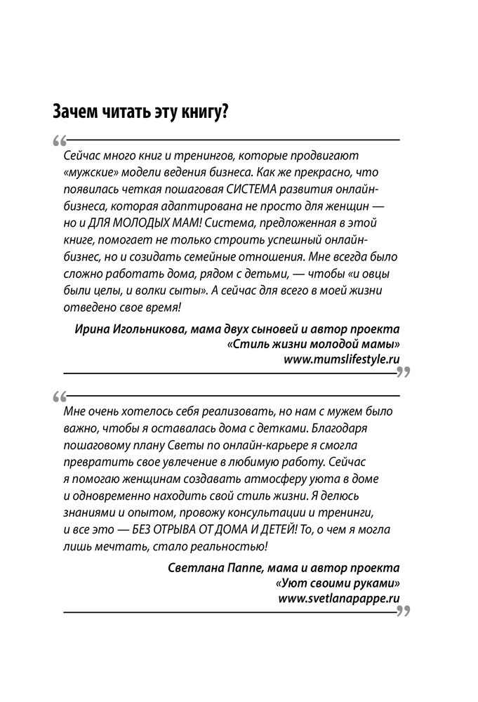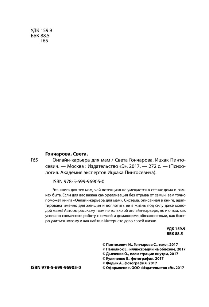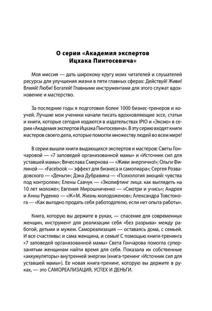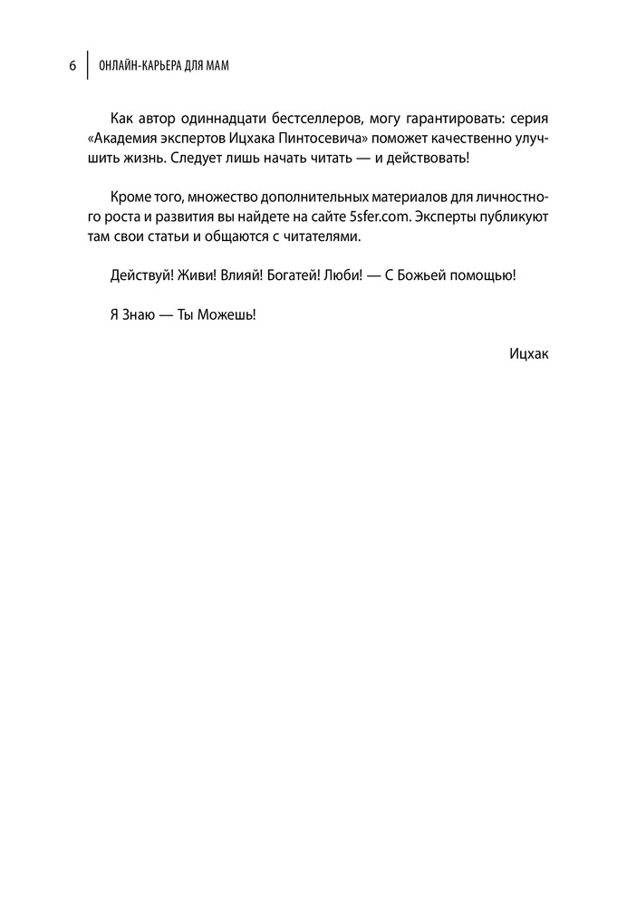 Онлайн-карьера для мамВ данный момент этот товар отсутствует в продаже. Возможно, у нас найдется аналогичный или похожий товар здесь. Серия: Психология. Академия экспертов Ицхака Пинтосевича Эта книга для тех мам, чей потенциал не умещается в стенах дома и рамках быта. Если для вас важна самореализация без отрыва от семьи, вам точно поможет книга «Онлайн-карьера для мам». Система, описанная в книге, адаптирована именно для женщин и воплотить ее в жизнь под силу даже молодой маме! Авторы расскажут вам не только об онлайн-карьере, но и о том, как успешно совместить работу с семьей и домашними обязанностями, как быстро учиться новому и как найти в Интернете дело своей жизни.С помощью этой книги вы найдете призвание, выстроите свою онлайн-карьеру и наладите действенный баланс между семьей и работой. В этой книге заключена необыкновенная сила, заставляющая поверить в себя и свои силы, чтобы вырастить детей и бизнес одновременно! |
