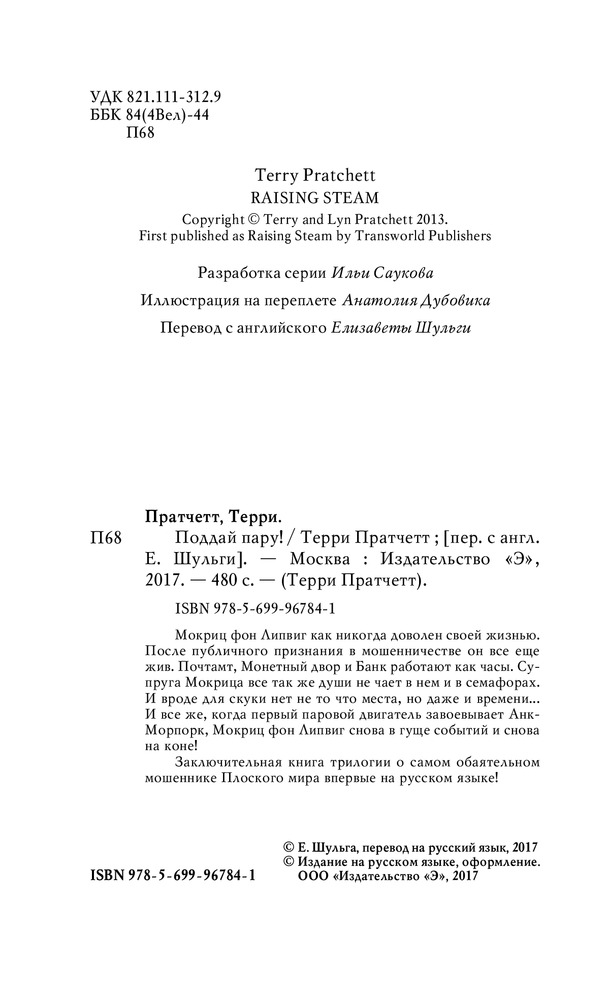 В данный момент этот товар отсутствует в продаже. Возможно, у нас найдется аналогичный или похожий товар здесь. Серия: Терри Пратчетт Мокриц фон Липвиг как никогда доволен своей жизнью. После публичного признания в мошенничестве он все еще жив. Почтамт, Монетный двор и Банк работают как часы. Супруга Мокрица все так же души не чает в нем и в семафорах. И вроде для скуки нет не то что места, но даже и времени... И все же, когда первый паровой двигатель завоевывает Анк-Морпорк, Мокриц фон Липвиг — снова в гуще событий, и снова на коне!
