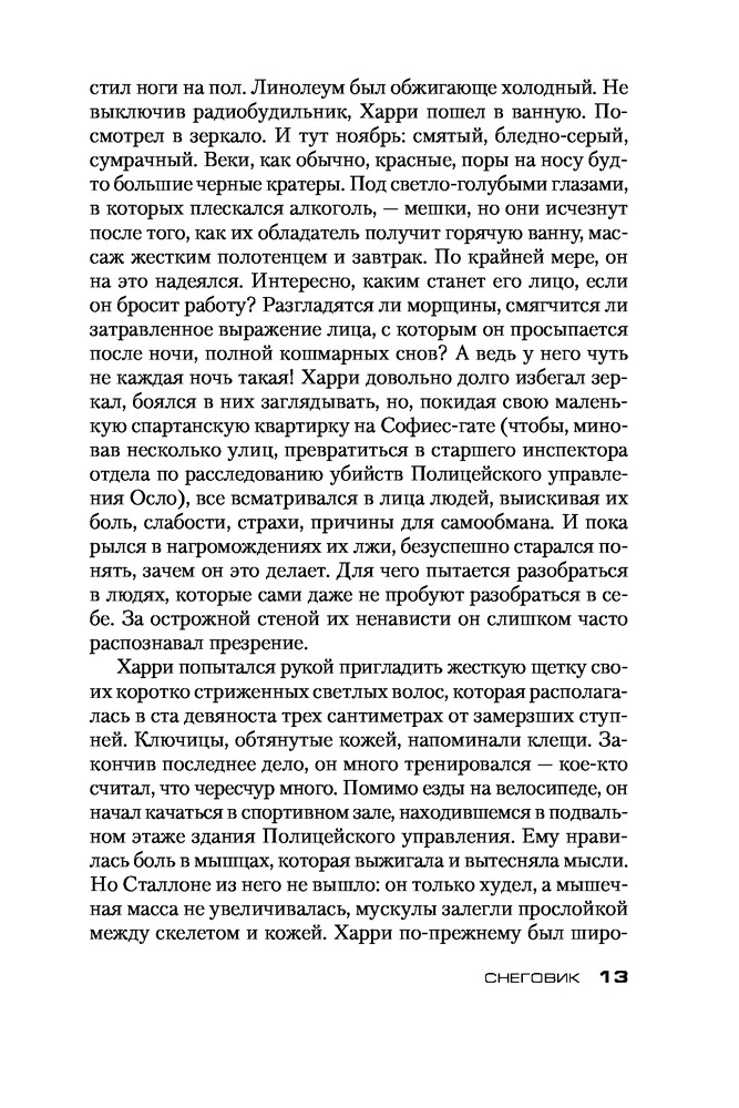 В Осло исчезают при странных обстоятельствах женщины, при том, что дома остаются дети и мужья. Ряд таких исчезновений, приводит к тому, что сотрудники полиции не могут раскрыть несколько дел. Тогда в их ряд по расследованию вступает опытный, умный следователь Харри Холе, которого к сожалению не жалуют из-за слабости к алкоголю, грубости и бесцеремонности к своим коллегам. Он находит приметы что всех женщин объединяет - то что они все замужние, и действие происходит с наступлением начало зимы, с появлением снега, когда убийца оставляет послание в виде СНЕГОВИКА. Местами произведение тянется, хочется перелистнуть страничку, но моменты когда описывается убийство, а также при откровенных сценах автор преображается. Его предложения наполнены живыми и яркими описаниями, что представляешь детально переживания жертвы, ее мысли и сам страх, что порой казалось что ты сама ею являешься и дыхание учащается от страха. Получше любого фильма в голове представляешь всех героев, и прокручивается свой фильм. Развязка в конце книги очень захватывает при чтении. Маньяк настолько изощрился, что просто удивляешься воображению автора. К сожалению, сам фильм снят не так, как ожидаешь после прочтения книги. Кстати, из других произведений автора, этот считается более слабее. Если вы знакомы с его другими детективами, то вам может сюжет показаться банальным. В принципе не могу сказать что книга просто супер, но отвлечься и погрузиться в легкое детективное чтиво можно Читайте отзывы и на другие книги в инстаграме: the.not.ice