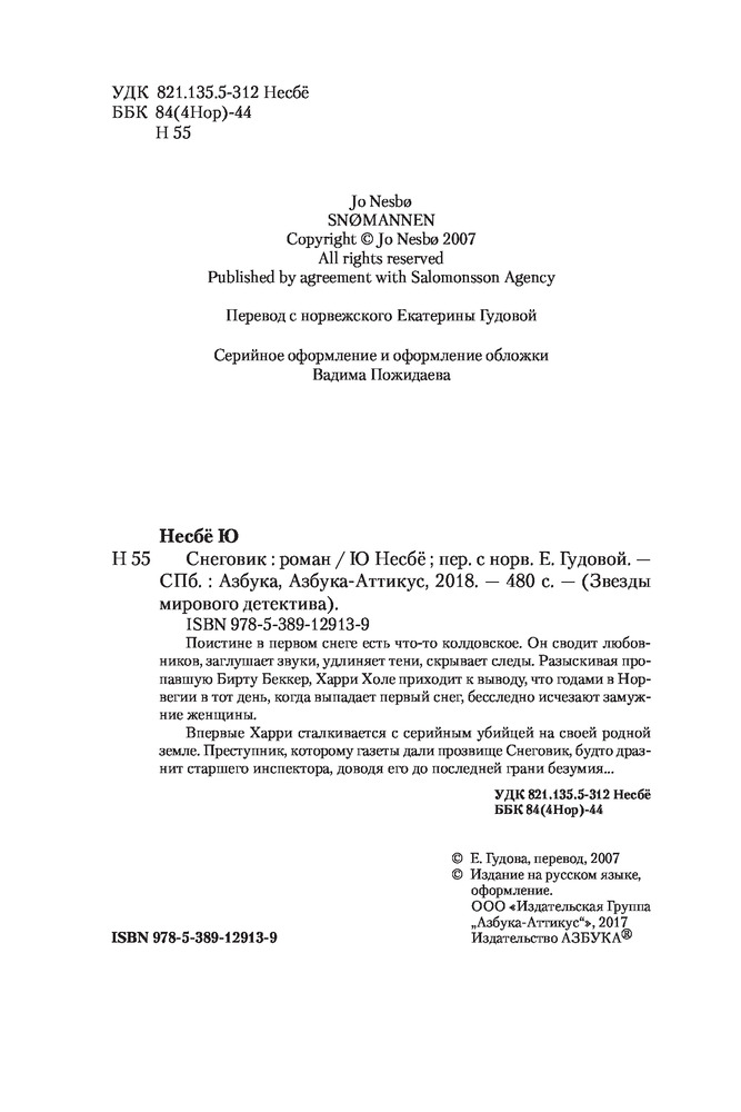 Впервые услышала о ней от книжного блогера на ютубе, девушка была в восторге) Узнав, что снеговика будут экранизировать, тем более главным героем будет Фассбендер, решила купить книгу и прочесть. Качество книги отличное! Белоснежные листы и читабельный шрифт! Спасибо магазину Флип за быструю доставку!