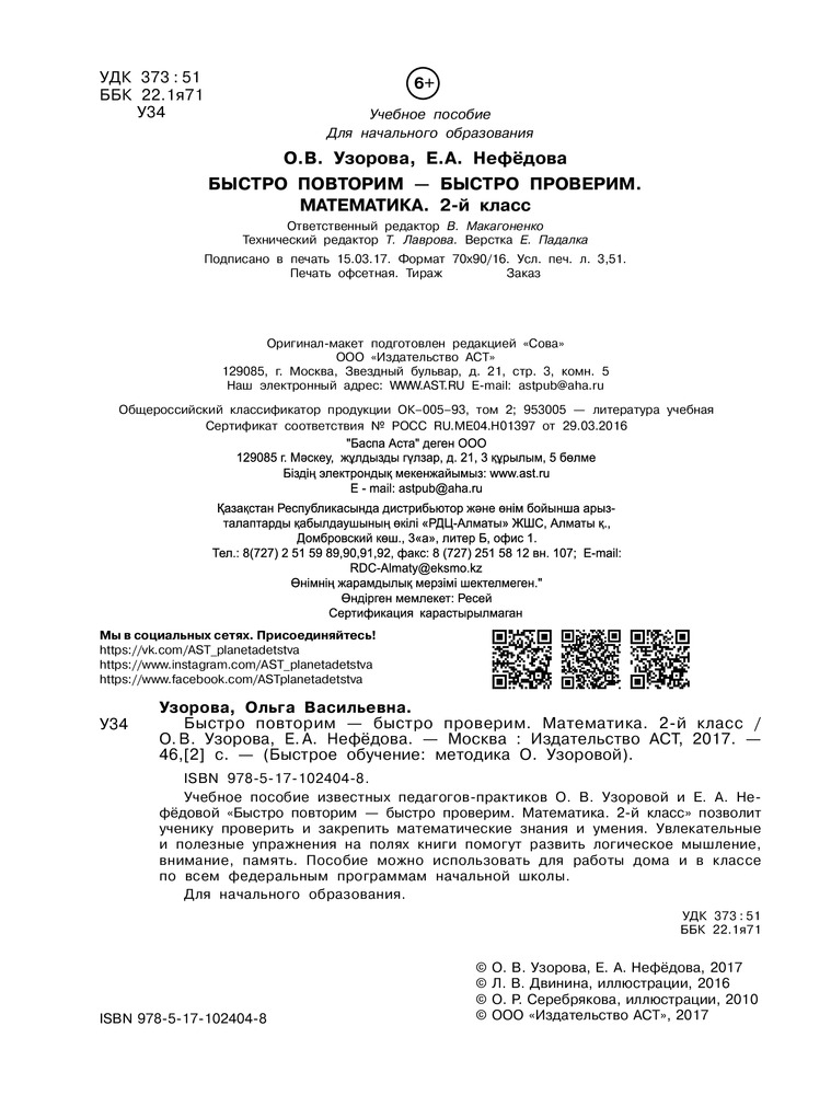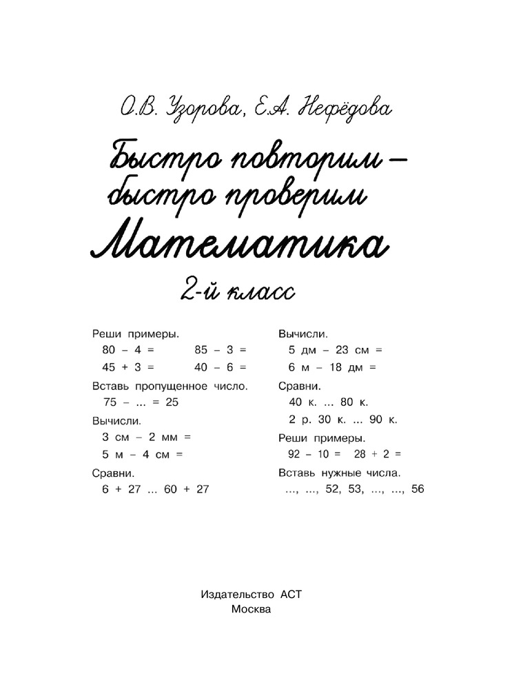 В данный момент этот товар отсутствует в продаже. Возможно, у нас найдется аналогичный или похожий товар здесь. Серия: Быстрое обучение письму Учебное пособие известных педагогов-практиков О.В. Узоровой и Е.А. Нефёдовой «Быстро повторим — быстро проверим. Математика. 2 класс» позволит ученику проверить и закрепить математические знания и умения. Увлекательные и полезные упражнения на полях книги помогут развить логическое мышление, внимание, память. Пособие можно использовать для работы дома и в классе по всем федеральным программам начальной школы.