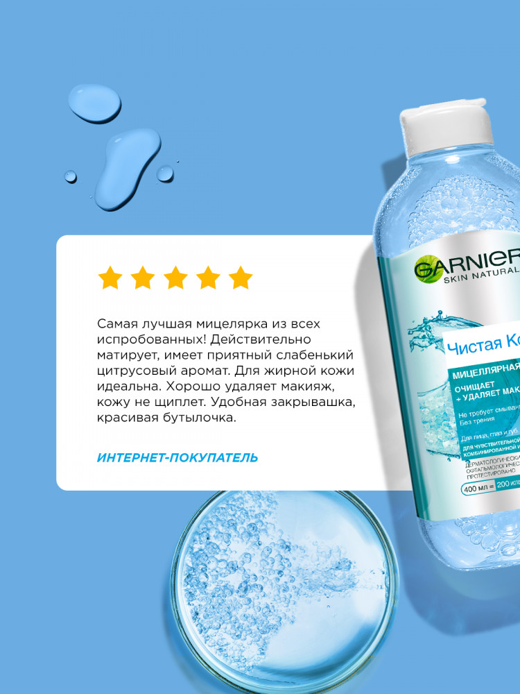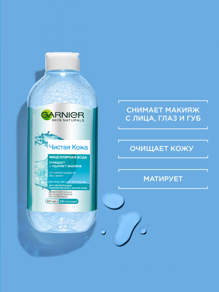 Garnier Мицеллярная вода «Чистая Кожа» для снятия макияжа и очищения кожи, для чувствительной жирной и комбинированной кожи, 400 мл-32% +67 снимает макияж не сушит матирует не раздражает для жирной и комбинированной кожи