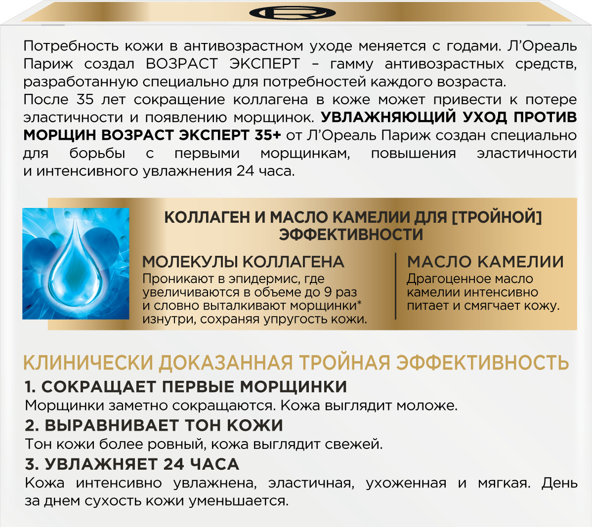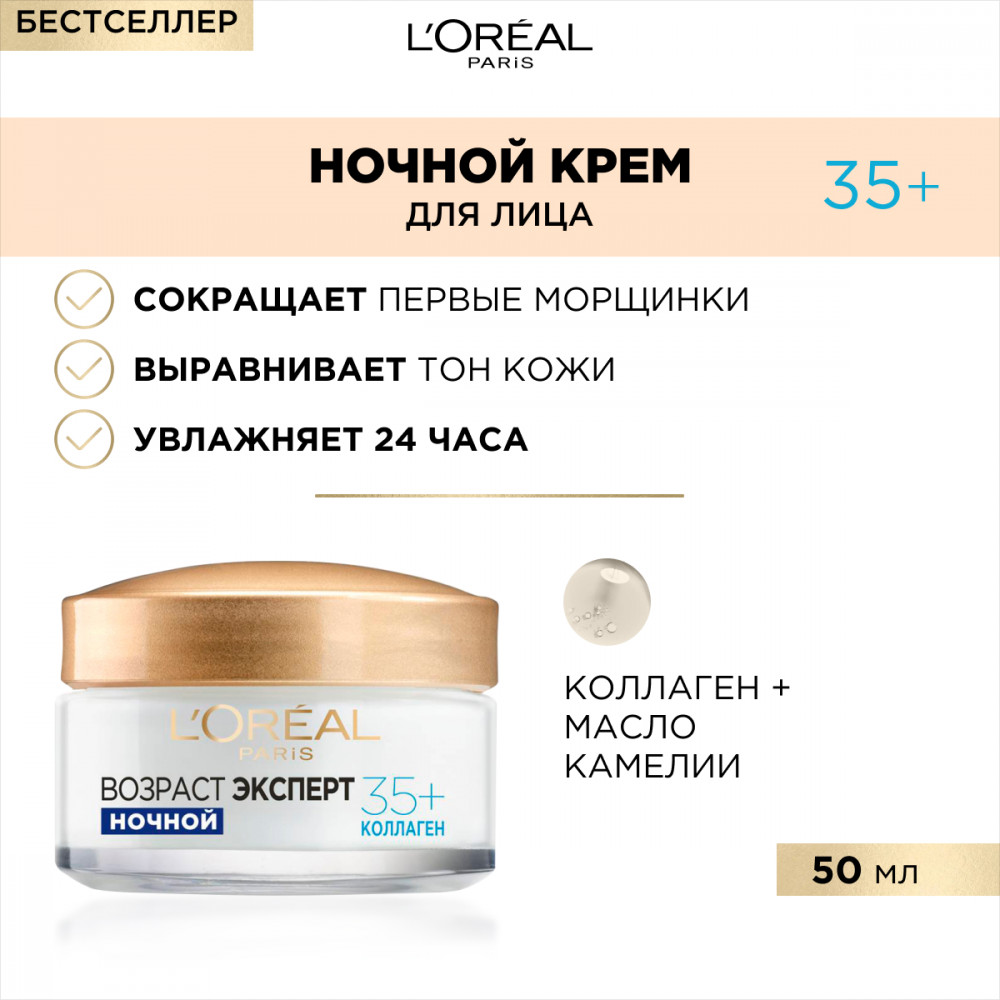 Возраст эксперт 35+ - то, что надо. Вот на 5+ по всем пунктам справляется. Прекрасная консистенция, приятный запах, легко наносится без ощущения жирной маски на лице, впитывается быстро с ощущением свежести и легкости кожи, на утро не нужно смывать его до бесконечности. За 4 месяца использования я реально вижу результат - кожа стала выглядеть более свежей, упругой. Расход крема экономичный, при использовании ежедневно на ночь на кожу лица и шеи за 4 месяца израсходовано примерно 1/3 баночки.