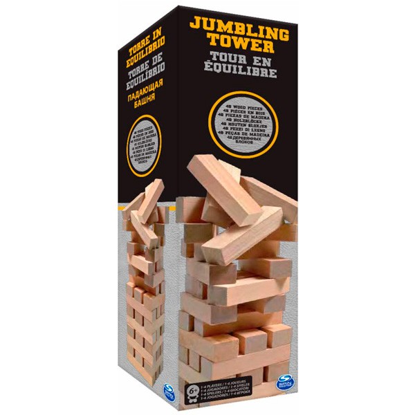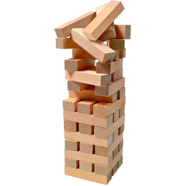 Отдали предпочтение из-за жестяной коробки и бюджетной цены. Бруски гладкие. Жаль, что бруски не образуют при постройке их вплотную ровного плотного блока. Длина брусков такова, что длинные части выступают за пределы коротких при плотной постройке, или нужно укладывать их с промежутками (как на фото башни). Это затрудняет первоначальную постройку и нарушает изначальное равновесие башни.