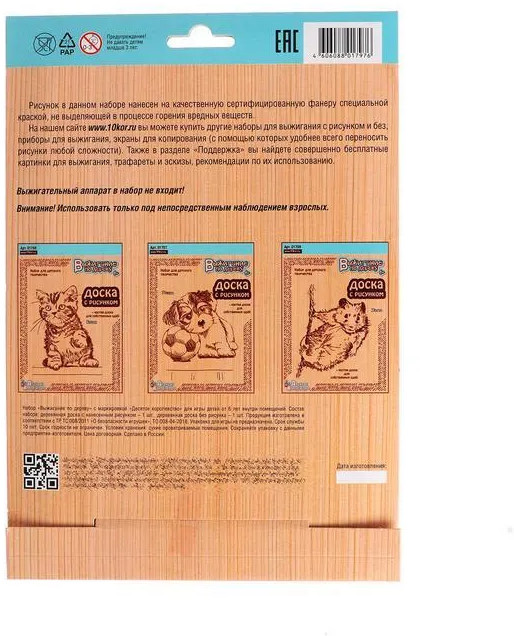 💳 Оплатить за товар можно при получении 🇰🇿 Есть бесплатная доставка по Казахстану 🎁 Копите бонусы с каждой покупки Серия: Давай выжигать Фанера для выжигания, 2 штуки в комплекте, с готовым рисунком и без него, для реализации собственных идей. На готовой картинке с помощью специальной краски, не выделяющей при горении вредных веществ, изображен симпатичный щенок с мячиком, которого обязательно захочется нарисовать вашему ребенку. |
