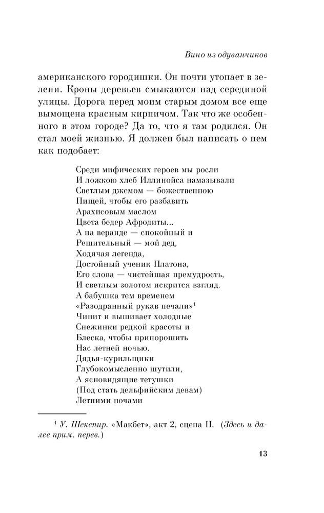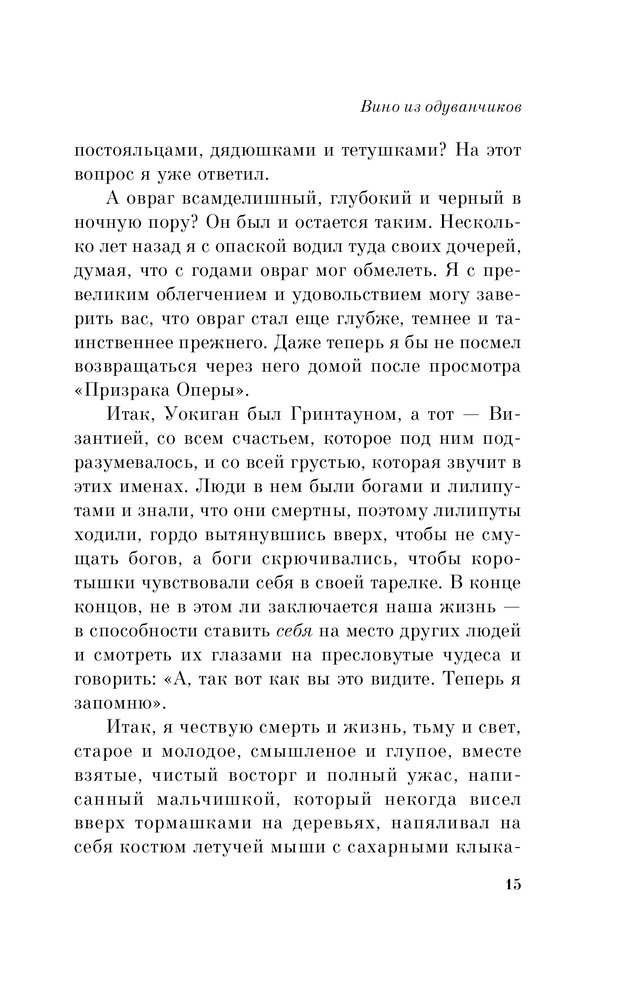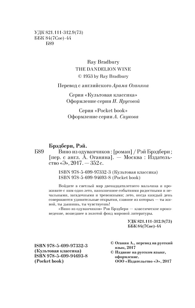 В данный момент этот товар отсутствует в продаже. Возможно, у нас найдется аналогичный или похожий товар здесь. Войдите в светлый мир двенадцатилетнего мальчика и проживите с ним одно лето, наполненное событиями радостными и печальными, загадочными и тревожными; лето, когда каждый день совершаются удивительные открытия, главное из которых — ты живой, ты дышишь, ты чувствуешь! «Вино из одуванчиков» Рэя Брэдбери — классическое произведение, вошедшее в золотой фонд мировой литературы.
