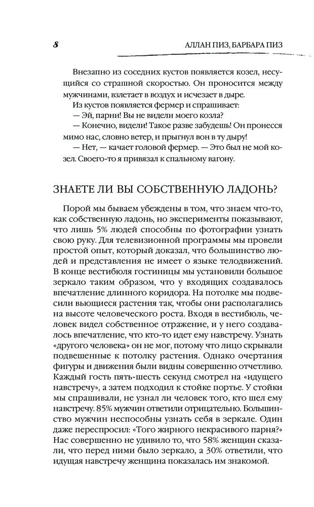 💳 Оплатить за товар можно при получении 🇰🇿 Есть бесплатная доставка по Казахстану от 1 дня 🎁 Копите бонусы с каждой покупки Серия: А и Б = Формула успеха (обложка, новое оформление) Новая книга Аллана и Барбары Пиз написана на основе их знаменитого бестселлера «Язык телодвижений», впервые вышедшего в свет в 1978 году, а затем переведенного на 48 языков и разошедшегося огромными тиражами: общее количество проданных экземпляров превысило 20 миллионов. В отличие от предыдущего варианта книги, теперь этот самый популярный и авторитетный в мире учебник «чтения мыслей окружающих по их жестам» затрагивает абсолютно все аспекты личной жизни и профессиональной деятельности любого человека. Авторы значительно расширили и дополнили издание, в книге появилось множество фотографий мировых знаменитостей, которые в данном случае используются в качестве своеобразных «учебных пособий». Ни один жест не остался без внимания! Мимика, позы, манеры, походка, взгляд — полная расшифровка всех телодвижений, по которым можно легко разгадать настоящие чувства и мысли других людей, — в новом бестселлере всемирно известных психологов! «Читать любого человека как книгу», выбирать правильную линию поведения, чувствовать себя уверенно и непринужденно в любой обстановке, принимать самые верные решения — все это теперь реально и доступно каждому. Эта книга также поможет вам осознать и собственные невербальные сигналы, научит использовать их для эффективного общения. Не позволяйте собой манипулировать. Изучайте новую, современную версию языка телодвижений — и вы непременно добьетесь успеха во всем! |