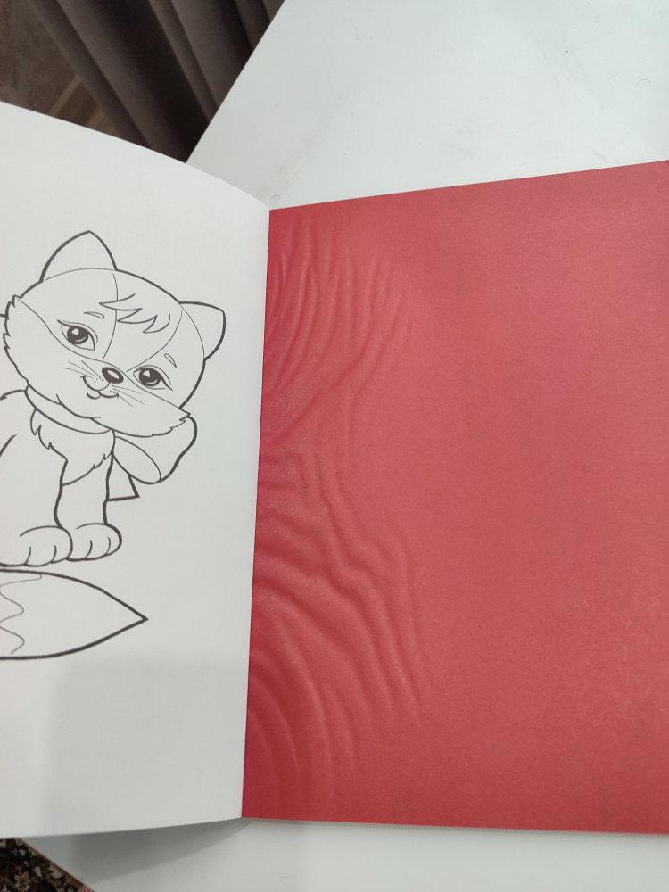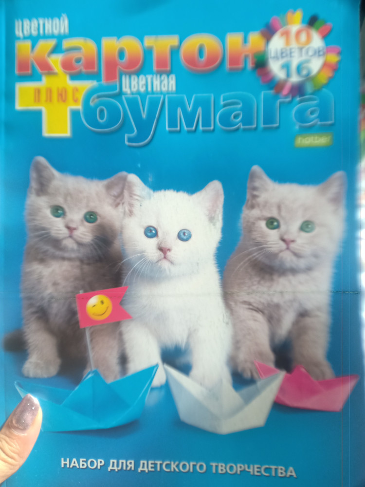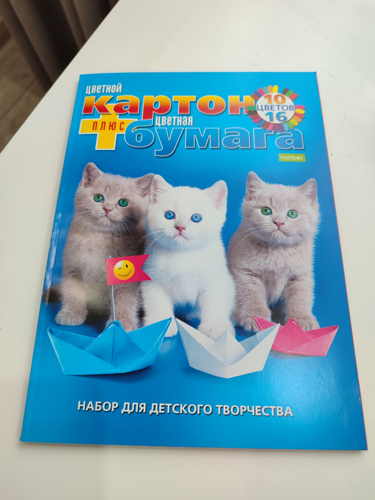 Набор отличный, двусторонняя бумага и односторонний картон. Для разнообразия докуплю еще одностороннюю бумагу, так как двусторонняя не везде нужна. На внутренней стороне обложки нарисован мультяшный котёнок, которого можно раскрасить или обклеить.