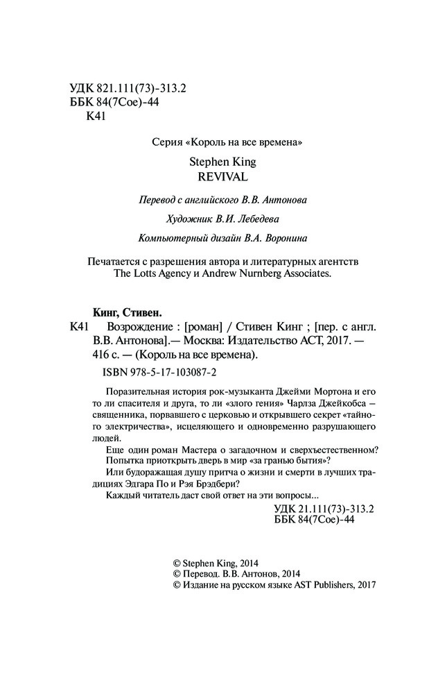 💳 Оплатить за товар можно при получении 🇰🇿 Есть бесплатная доставка по Казахстану от 1 дня 🎁 Копите бонусы с каждой покупки Серия: Король на все времена «Испуганные люди живут в своем собственном аду. Можно сказать, они создают его сами», — такова, пожалуй, основная мысль «Возрождения» — нового романа Стивена Кинга, одного из наиболее ярких и значимых прозаиков США. |