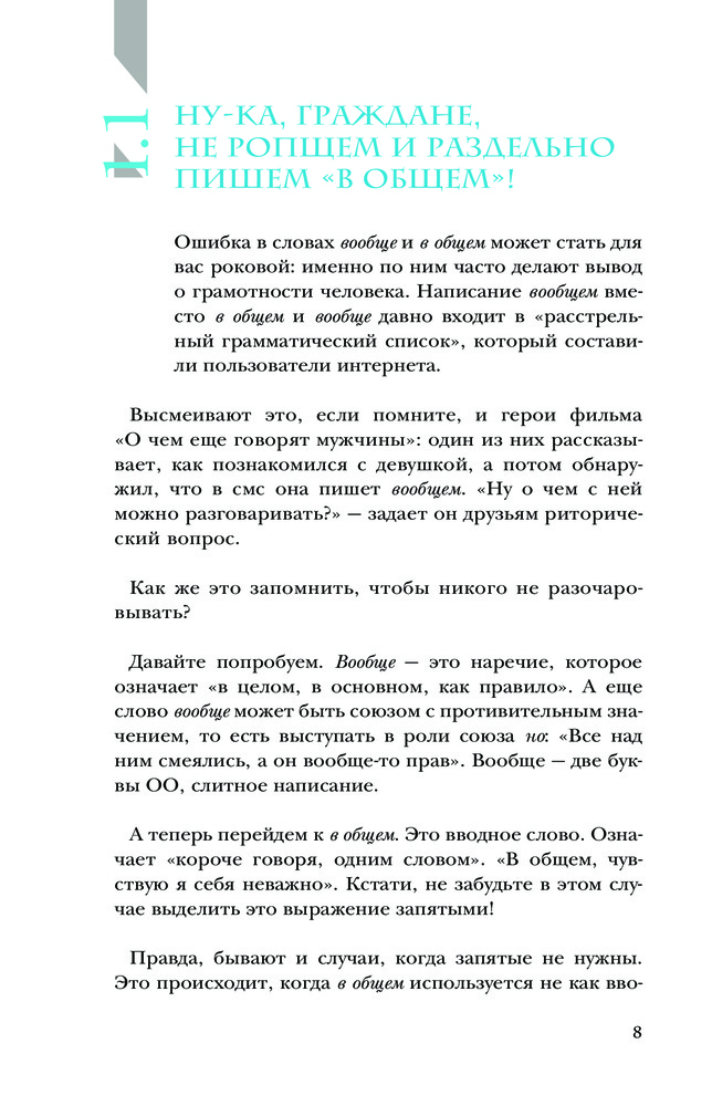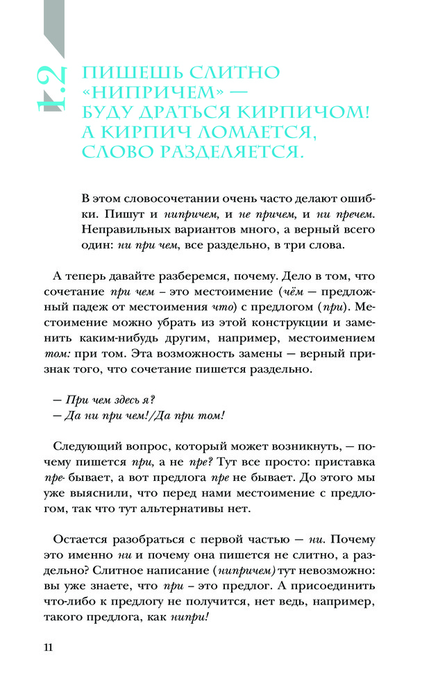 Русский без нагрузкиВ данный момент этот товар отсутствует в продаже. Возможно, у нас найдется аналогичный или похожий товар здесь. Серия: Научпоп Рунета Книга намеренно задумана как инструмент: Юлия Андреева и Ксения Туркова подобрали типичные ошибки в речи, письменной и устной, объяснили их простым языком и упаковали в понятную для читателя форму — с помощью мнемонических стихотворений и почти 120 забавных и запоминающихся иллюстраций любой научится отличать «вообще» от «в общем», «одеть» от «надеть» и даже «вследствие» от «впоследствии». |