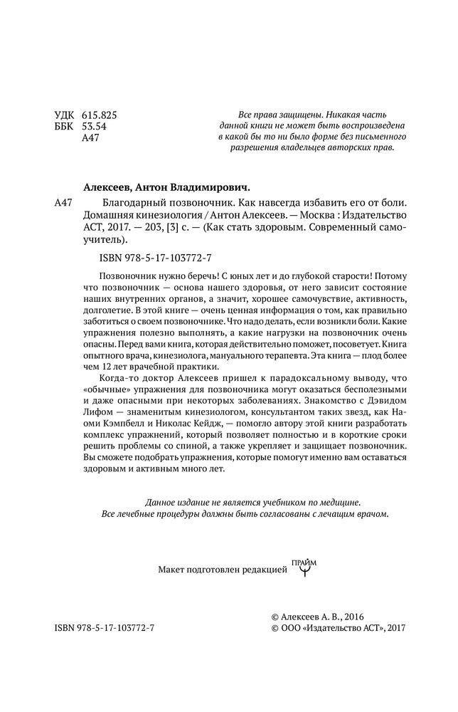 Благодарный позвоночник. Как навсегда избавить его от боли. Домашняя кинезиологияВ данный момент этот товар отсутствует в продаже. Возможно, у нас найдется аналогичный или похожий товар здесь. Серия: Как стать здоровым. Современный самоучитель Позвоночник нужно беречь! С юных лет и до глубокой старости! Потому что позвоночник — основа нашего здоровья, от него зависит состояние наших внутренних органов, а значит, хорошее самочувствие, активность, долголетие. В этой книге — очень ценная информация о том, как правильно заботиться о своем позвоночнике. Что надо делать, если возникли боли. Какие упражнения полезно выполнять, а какие нагрузки на позвоночник очень опасны. Перед вами книга, которая действительно поможет, посоветует. Книга опытного врача, кинезиолога, мануального терапевта. Эта книга — плод более чем 12 лет врачебной практики. |