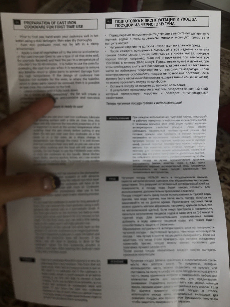 Я только что получила свой заказ и я уже в восторге! Сковорода шикарная! Но самое главное- это инструкция! Подробная! Для новичков в общении с чугуном. За что огромное спасибо. После использования обязательно добавлю отзыв.