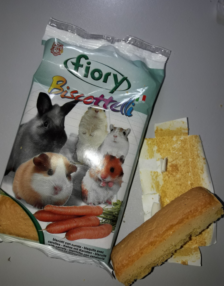 Прикольные,сухие бисквитики.Морской свин не оценил,а вот крыс лопает с удовольствием.Пахнут очень сладко.Бумажка правда от бисквитика отрывается плохо. Упаковано хорошо.Спасибо.