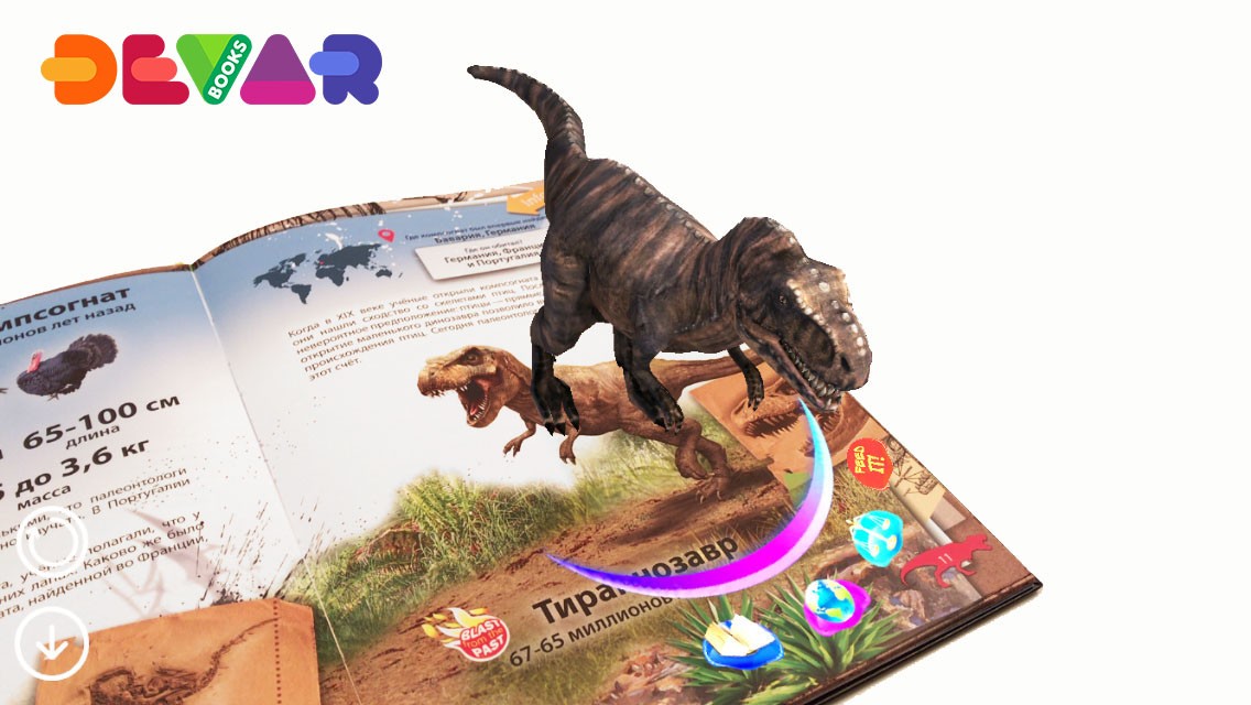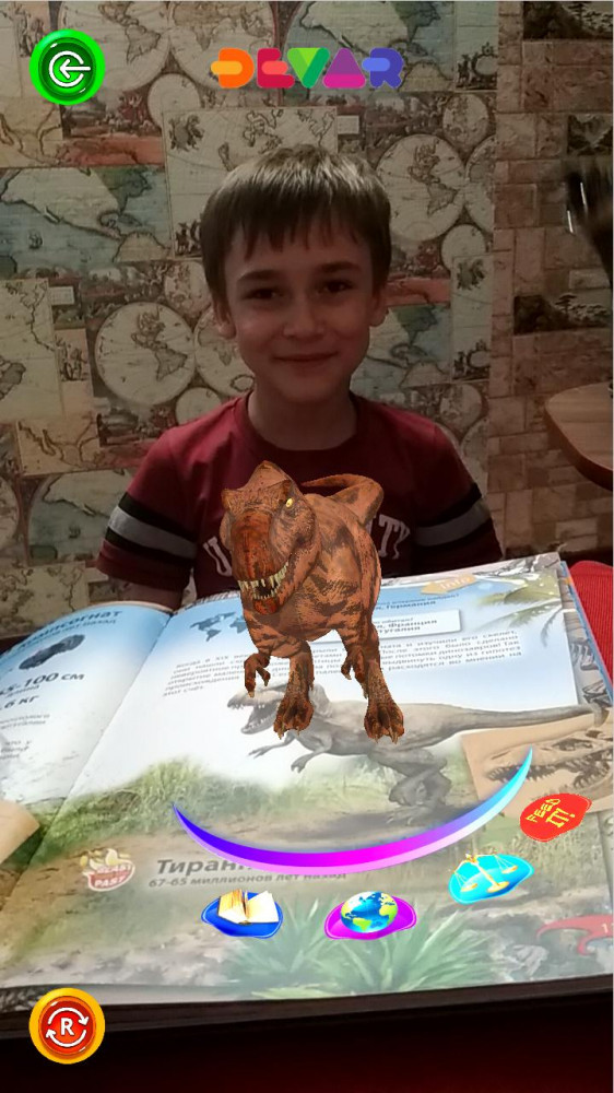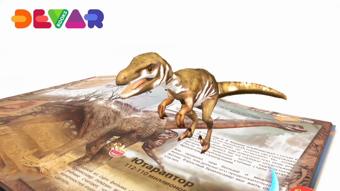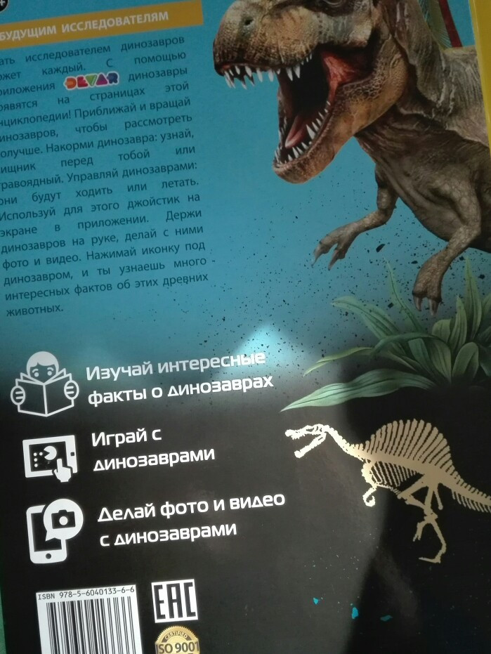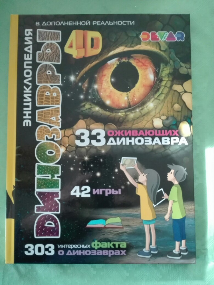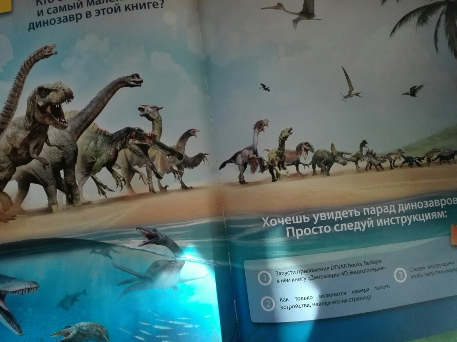 Энциклопедия классная. На каждой странице динозавры. Установили приложение Devar, всё работает. Круто оживают динозавры .