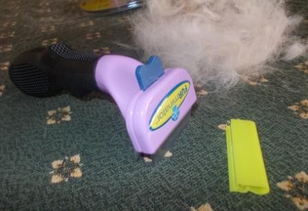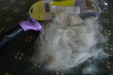 Взгляд кота: "жизнь удалась"! Очень переживала, вещь недешевая, а вдруг ему будет больно/неприятно. Но все довольны! Очень удобная вещь) В наборе ещё маленький чехол для расчёски. На фото кол-во шерсти за 5 минут)