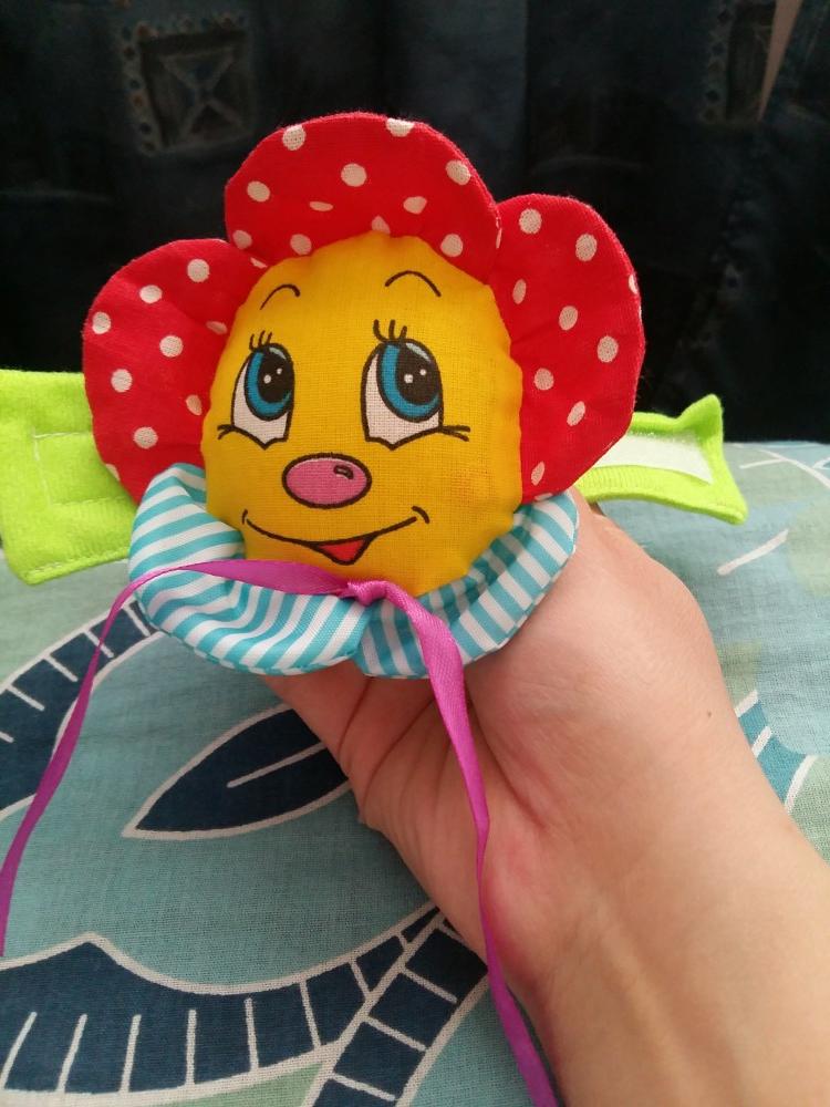 Дочке 4,5 месяца, нам уже интересно, играет с удовольствием. Диаметр цветочка вместе с лепестками 11 см. Цвета на фото ниже. Разный материал: браслетик мягкий трикотаж, некоторые лепестки с хрустящим наполнителем внутри. Погремушка с мягким звуком слышна хорошо и не очень громко. Цвета после ручной стирки не поблекли.