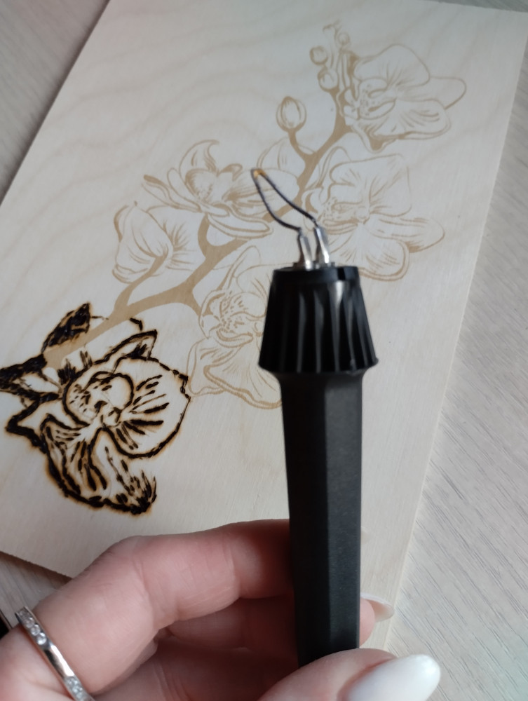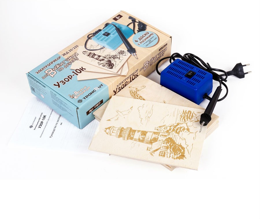Сам прибор тяжёлый, внушает доверие, хороший длинный шнур, наличие досточек с рисунками и без. Огорчило отсутствие подставки для ручки-выжигателя и в первый же день использования деформировалась игла, но функции свои продолжает выполнять