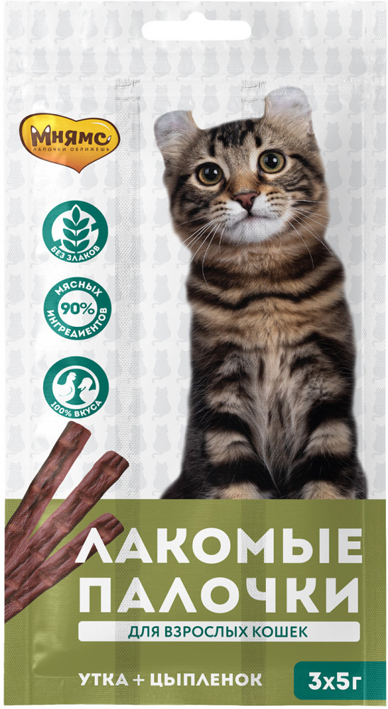 | Мнямс Лакомые палочки для кошек с цыпленком и уткой (13,5 см, 3 шт х 5 г)