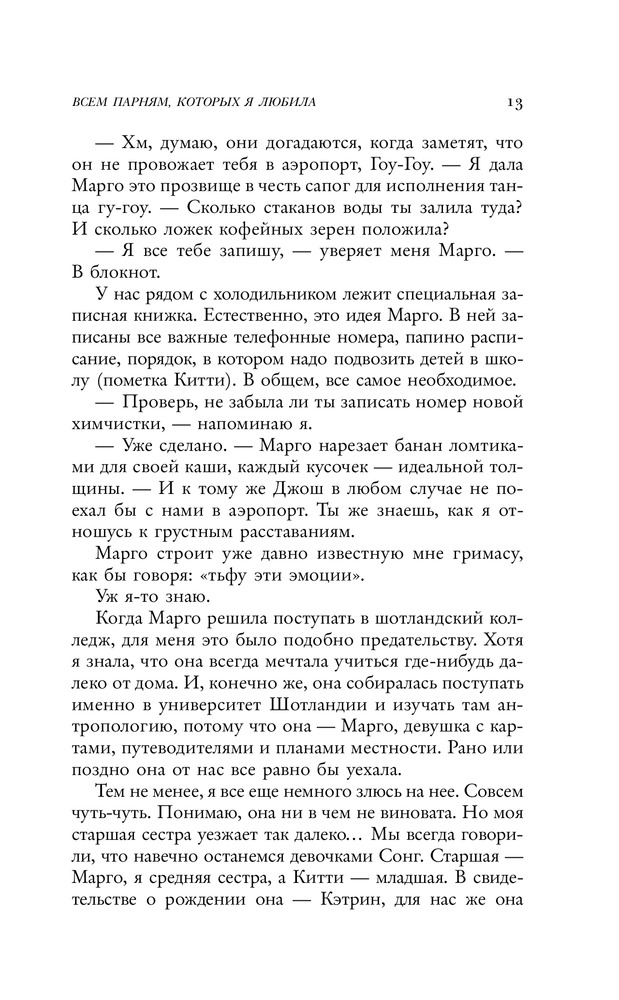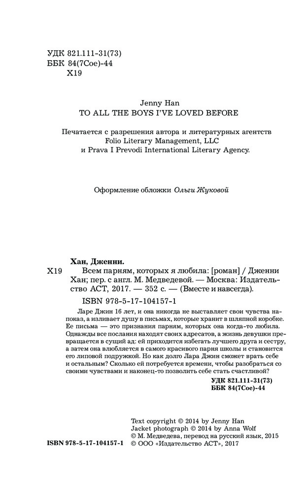 Всем парням, которых я любилаВ данный момент этот товар отсутствует в продаже. Возможно, у нас найдется аналогичный или похожий товар здесь. Серия: Вместе и навсегда Ларе Джин 16 лет, и она никогда не выставляет свои чувства напоказ, а изливает душу в письмах, которые хранит в шляпной коробке. Ее письма — это признания парням, которых она когда-то любила. |