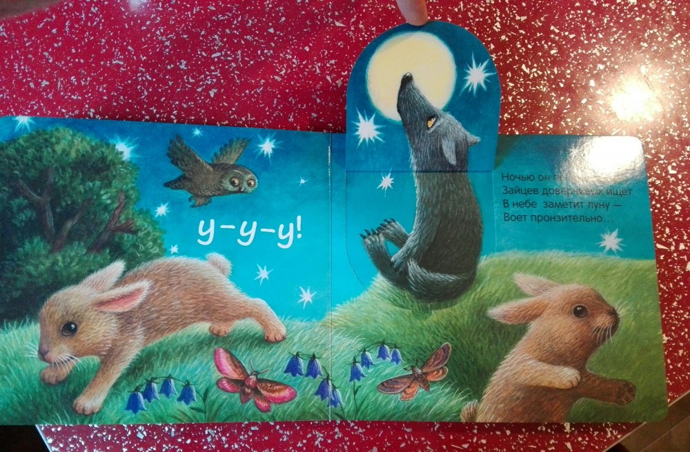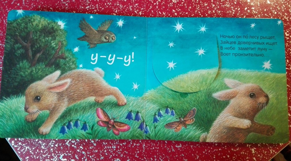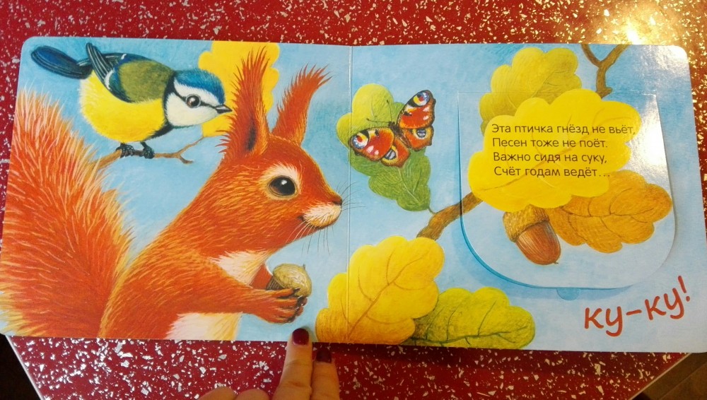 Книга очень понравилась дочке 1,4. Ее любимая. Очень красиво иллюстрирована и качественно сделана. Пока дочка открывает окошко, мама успевает прочесть стишок. Повторяет звуки