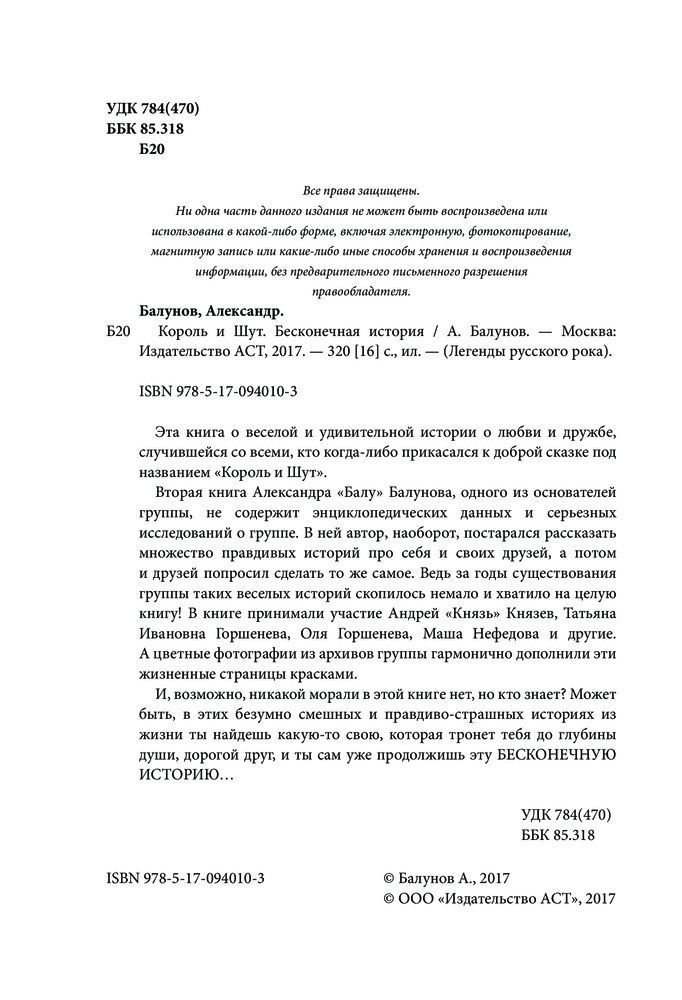 💳 Оплатить за товар можно при получении 🇰🇿 Есть бесплатная доставка по Казахстану от 1 дня 🎁 Копите бонусы с каждой покупки Эта книга о веселой и удивительной истории о любви и дружбе, случившейся со всеми, кто когда-либо прикасался к доброй сказке под названием «Король и Шут». Вторая книга Александра «Балу» Балунова, одного из основателей группы, не содержит энциклопедических данных и серьезных исследований о группе. В ней автор, наоборот, постарался рассказать множество правдивых историй про себя и своих друзей, а потом и друзей попросил сделать то же самое. Ведь за годы существования группы таких веселых историй скопилось немало и хватило на целую книгу! В книге принимали участие Андрей «Князь» Князев, Татьяна Ивановна Горшенева, Оля Горшенева, Маша Нефедова и другие. А цветные фотографии из архивов группы гармонично дополнили эти жизненные страницы красками. И, возможно, никакой морали в этой книге нет, но кто знает? Может быть, в этих безумно смешных и правдиво-страшных историях из жизни ты найдешь какую-то свою, которая тронет тебя до глубины души, дорогой друг, и ты сам уже продолжишь эту бесконечную историю... |