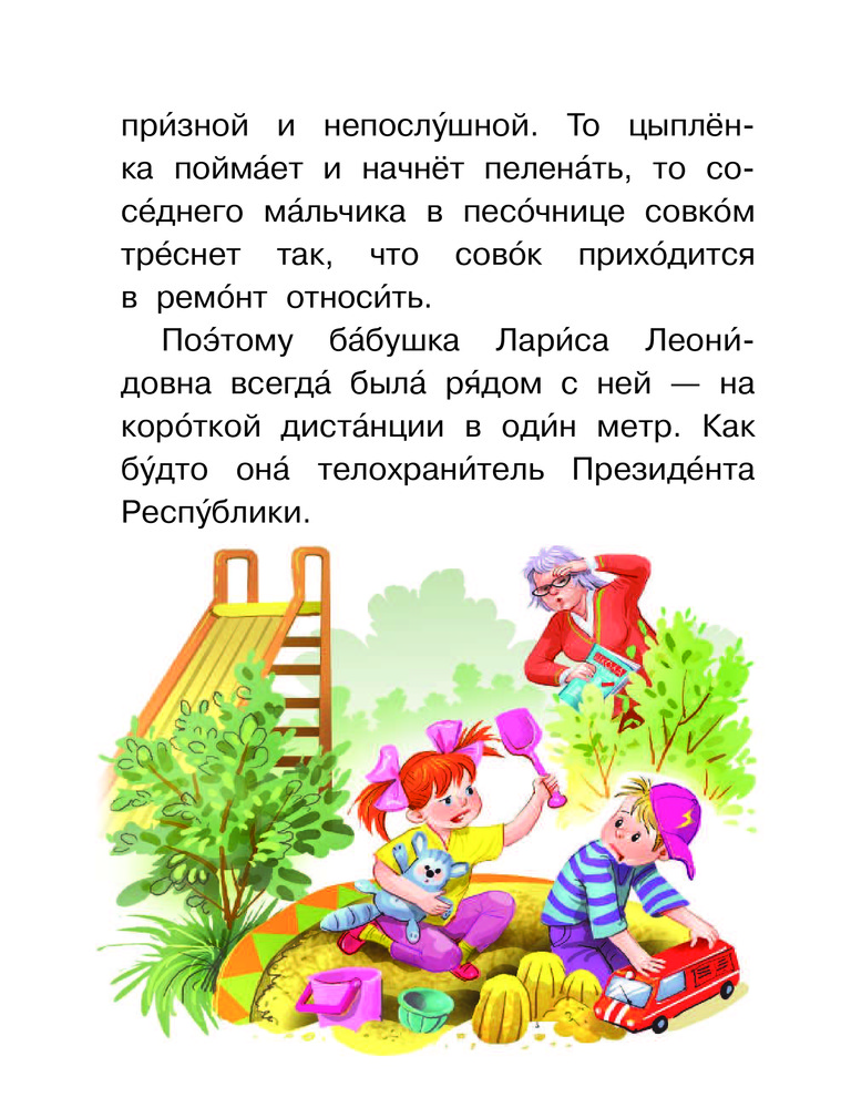 Рисунки яркие, буквы крупные, над словами стоят ударения. Сыну 7 лет, читает с удовольствием. Недостаток - всего три рассказа, ожидала больше.