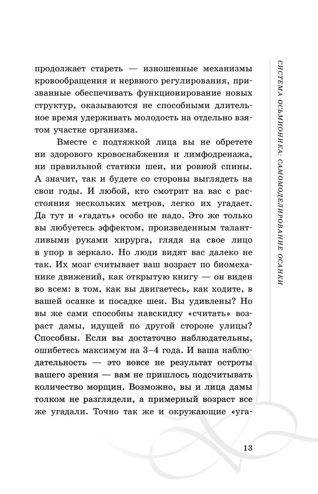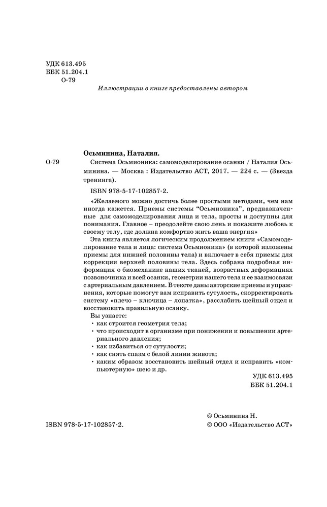Эта книга является логическим продолжением книги «Самомоделирование тела и лица: система Осьмионика» (в которой изложены приемы для нижней половины тела) и включает в себя приемы для коррекции верхней половины тела. Здесь собрана подробная информация о биомеханике наших тканей, возрастных деформациях позвоночника и всей осанки, геометрии нашего тела и ее взаимосвязи с артериальным давлением. В тексте даны авторские приемы и упражнения, которые помогут вам исправить сутулость, скорректировать систему «плечо — ключица — лопатка», расслабить шейный отдел и восстановить правильную осанку.