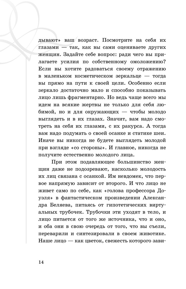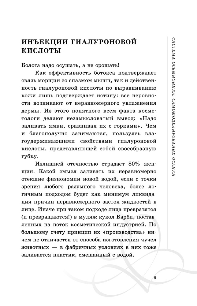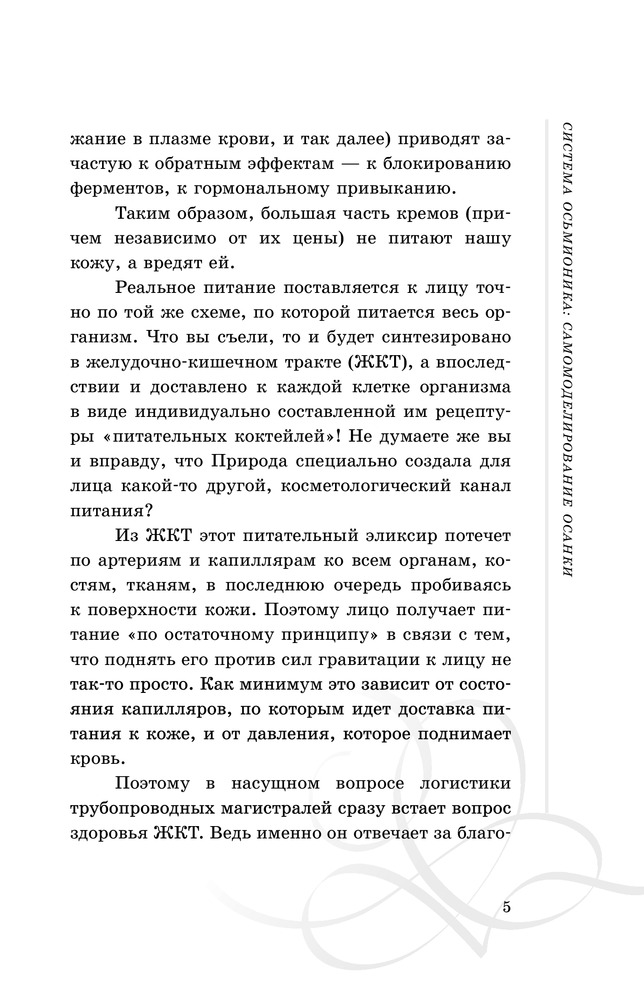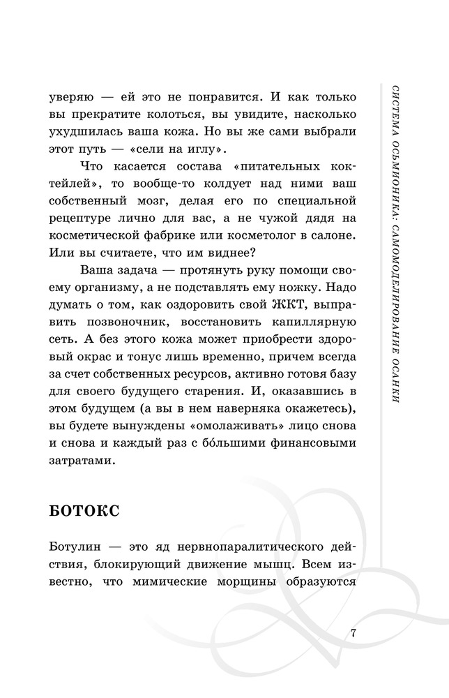 «Желаемого можно достичь более простыми методами, чем нам иногда кажется. Приемы системы „Осьмионика“, предназначенные для самомоделирования лица и тела, просты и доступны для понимания. Главное — преодолейте свою лень и покажите любовь к своему телу, где должна комфортно жить ваша энергия».