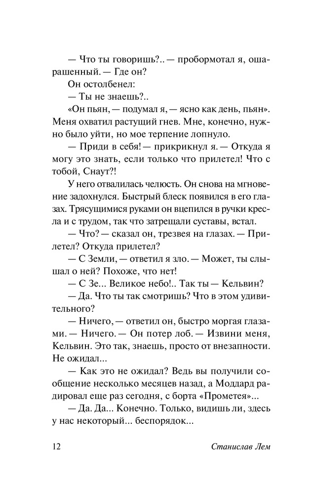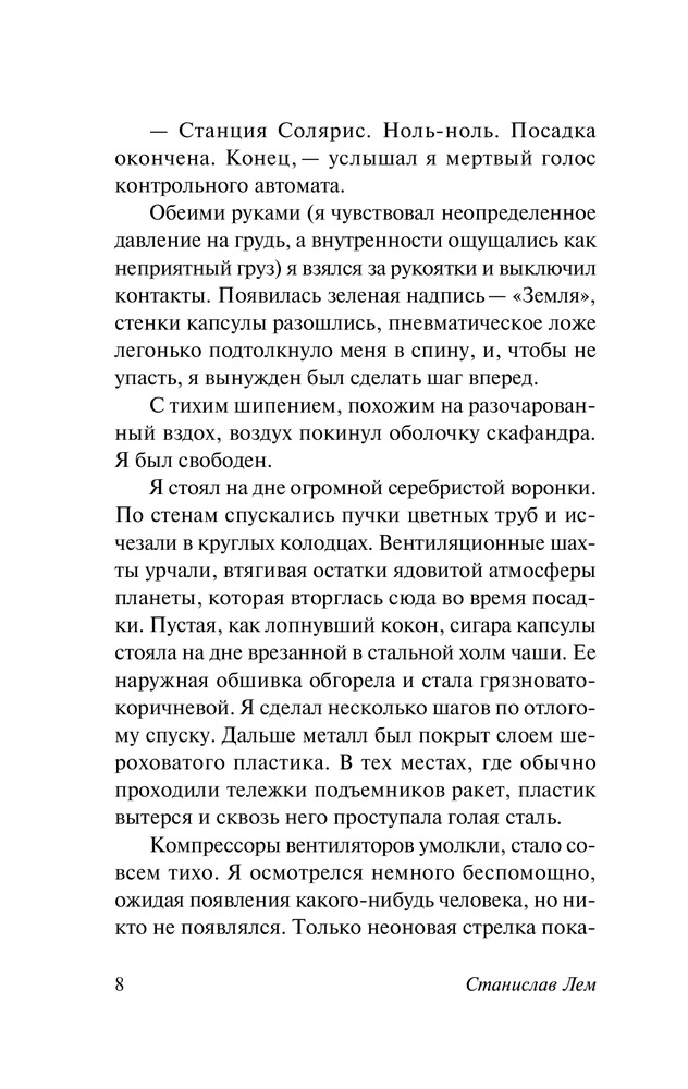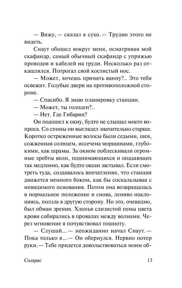 Итак, «Солярис», планета, которая манит исследователей и учёных своей таинственностью и уникальностью. Жители «песчинки в бескрайнем океане(Земля)» отправляются на встречу с «другой неведомой песчинкой всё того же океана(Солярис)». С такими мыслями я начинал читать данную историю, т.к. жанр фантастики для меня, очевидно, совсем неродной. Если откровенно, людей тянет познать каких-то инопланетян(выдумать*), найти и освоить непригодные для жизни планеты(выдумать*), когда эти самые люди зачастую даже в себе не могут разобраться и «генеральную уборку в голове провести», и мы своей планеты до конца ещё не знаем(быть может поэтому я фанатом звёздных войн так и не стал -_-), пора прекращать занудствовать. Что касается книги…и пяти страниц не понадобилось, я увлёкся текстом, скепсис заперев в шкаф. Да что там увлёкся, я теории начал строить вокруг происходящего, кстати, некоторые дожили до последних страниц. Занимательное повествование, с вкраплениями глубокомыслия, философии, психологии. Субъективно, для меня - тема смысла существования, тайны нашего подсознания, страхи и комплексы, переживания, нечто бессознательное в человеке - стояло выше, чем описание самого Соляриса с его уникальными процессами и покрывающим практически полностью поверхность планеты океаном, хотя он оказался совсем не прост, океан как нечто «Божественное» и манящее своей таинственностью. «Книга с изюминкой», побудила задуматься о своём собственном «я», да и в целом, поразмыслить о вечном. Предположу, что читатель книгу будет трактовать по-своему, и это нормально, каждый найдёт что-то своё в этом необычном романе. Присутствует ощущение, что и я, прочитав через какое-то время «Солярис» ещё раз, найду в нём какие-либо новые грани. Для тех, кто далёк от жанра фантастики, как и я сам…я посоветую хотя бы начать, дать шанс этому короткому произведению, авось оно зайдёт и для Вас. Издание радует, уже собралась коллекция, что закономерно…качество книг и сами произведения – приводят в восторг.