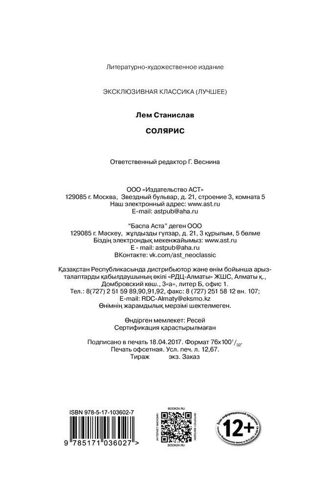 💳 Оплатить за товар можно при получении 🇰🇿 Есть бесплатная доставка по Казахстану от 1 дня 🎁 Копите бонусы с каждой покупки Серия: Эксклюзивная классика (Лучшее) «Солярис» — бесспорная вершина творчества Станислава Лема, произведение, повлиявшее на развитие научной фантастики XX века, в том числе и на русскую фантастику. Роман дважды экранизирован, по нему были поставлены радиопьесы, спектакли — и даже балет! |