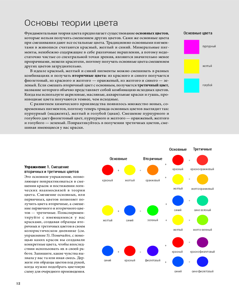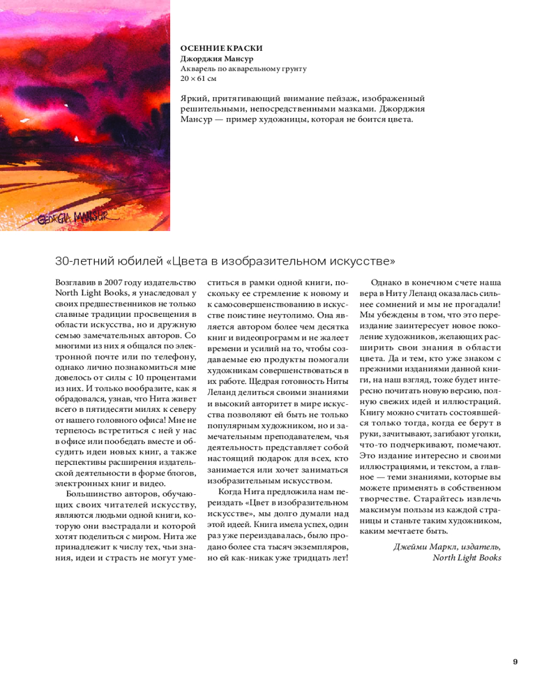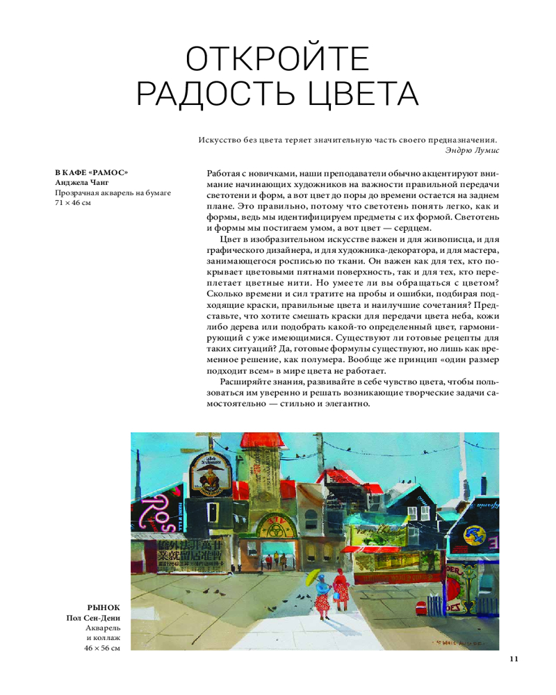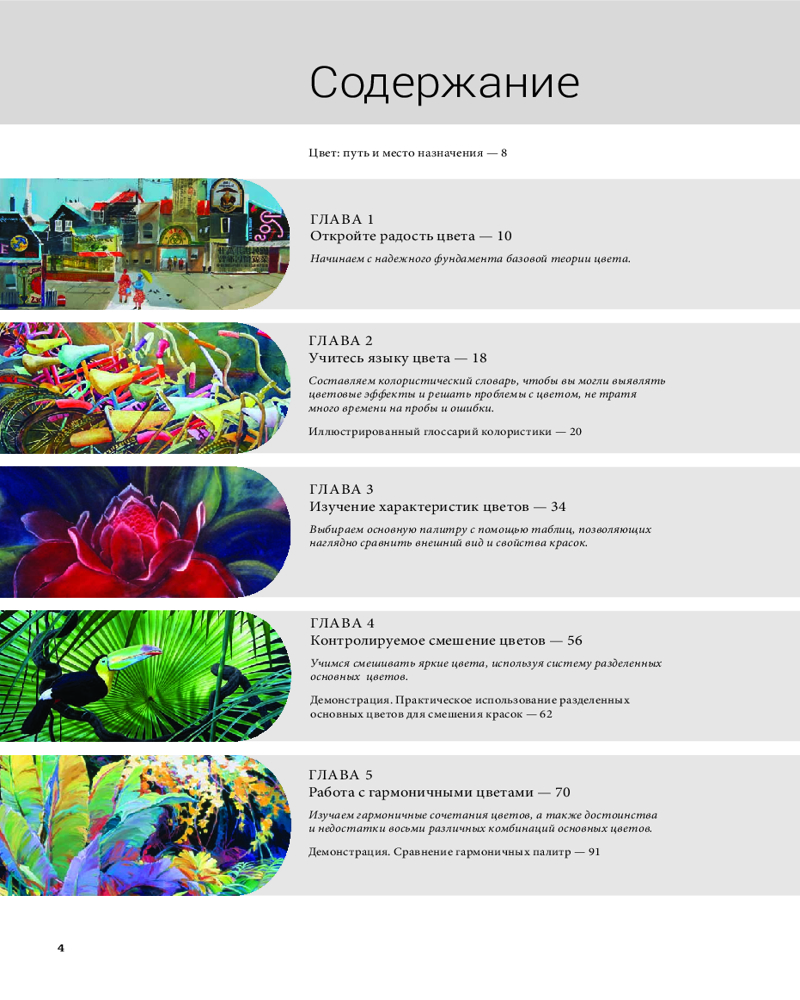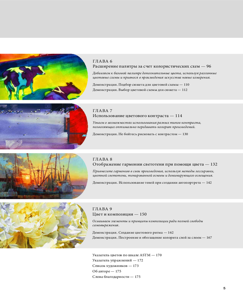 Отлично иллюстрированная книга, хорошая печать. Здесь и теория цвета, понятия тона, светлоты, контраста, светотени, цвета и композиции. Очень много информации и упражнений с цветом и красками, для примеров использованы работы современных американских и западных художников.