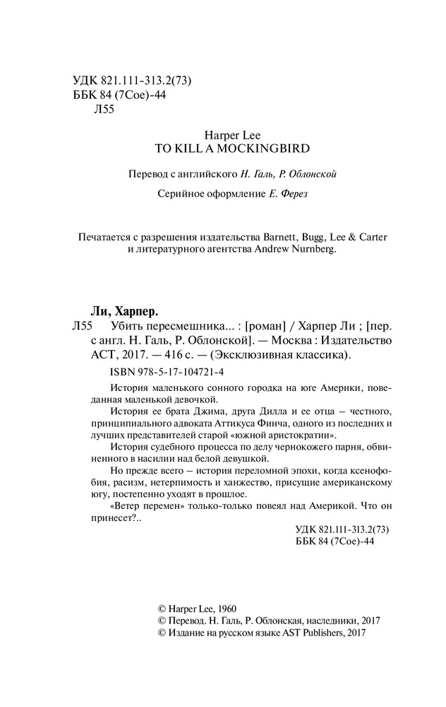 💳 Оплатить за товар можно при получении 🇰🇿 Есть бесплатная доставка по Казахстану 🎁 Копите бонусы с каждой покупки Серия: Эксклюзивная классика (Лучшее) История маленького сонного городка на юге Америки, поведанная маленькой девочкой. История ее брата Джима, друга Дилла и ее отца — честного, принципиального адвоката Аттикуса Финча, одного из последних и лучших представителей старой «южной аристократии». История судебного процесса по делу чернокожего парня, обвиненного в насилии над белой девушкой. Но прежде всего — история переломной эпохи, когда ксенофобия, расизм, нетерпимость и ханжество, присущие американскому югу, постепенно уходят в прошлое. «Ветер перемен» только-только повеял над Америкой. Что он принесет?.. |