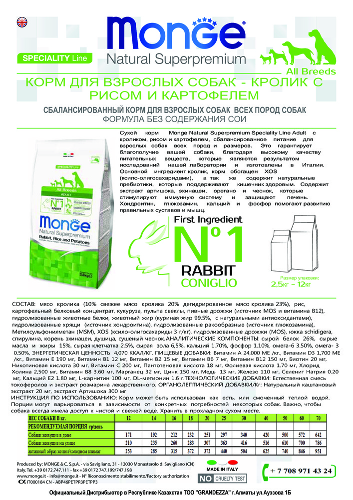 Сухой корм Monge Natural Superpremium Speciality Line Adult с кроликом, рисом и картофелем, сбалансированное питание для взрослых собак всех пород и размеров. Это гарантирует благополучие вашей собаки, благодаря высокому качеству питательных веществ, которые являются результатом исследований нашей лаборатории и изготовлены в Италии. Основной ингредиент кролик, корм обогащен XOS (ксило-олигосахаридами), а так же содержит натуральные пребиотики, которые поддерживают кишечник здоровым. Содержит экстракт артишока, эхинацеи, орегано и чеснок, которые стимулируют иммунную систему и защищают печень. Хондроитин, глюкозамин, кальций и фосфор помогают развитию правильных суставов и мышц.