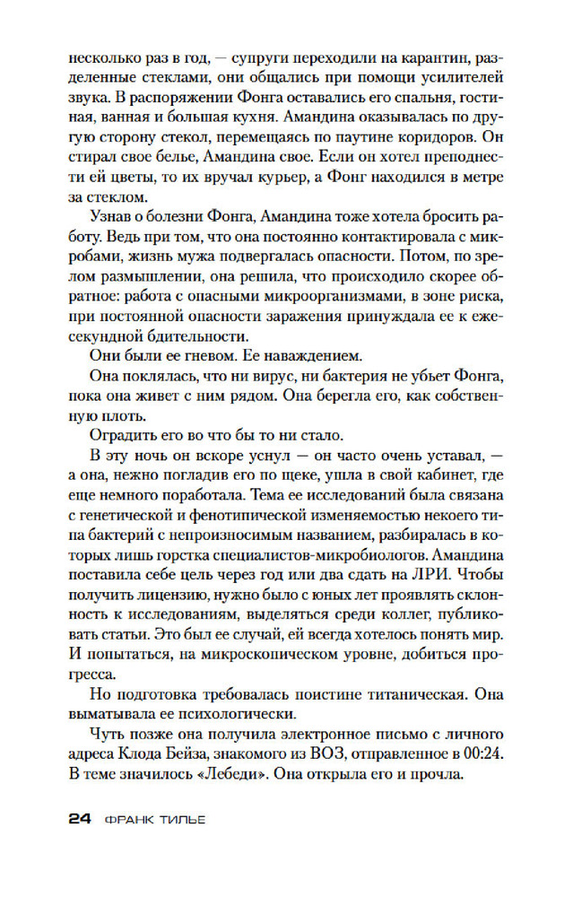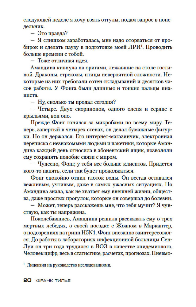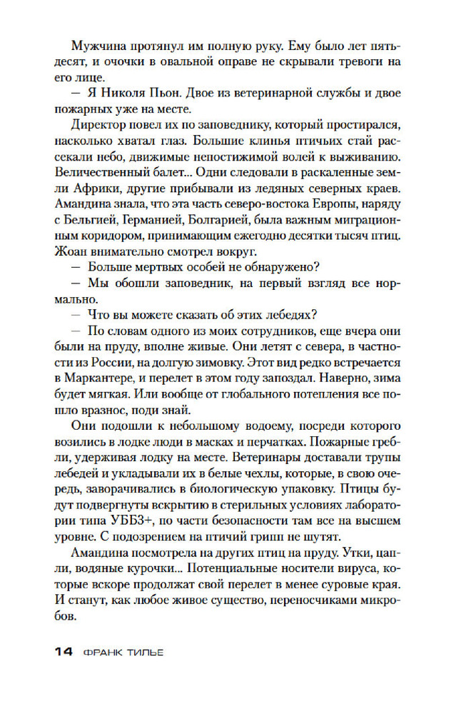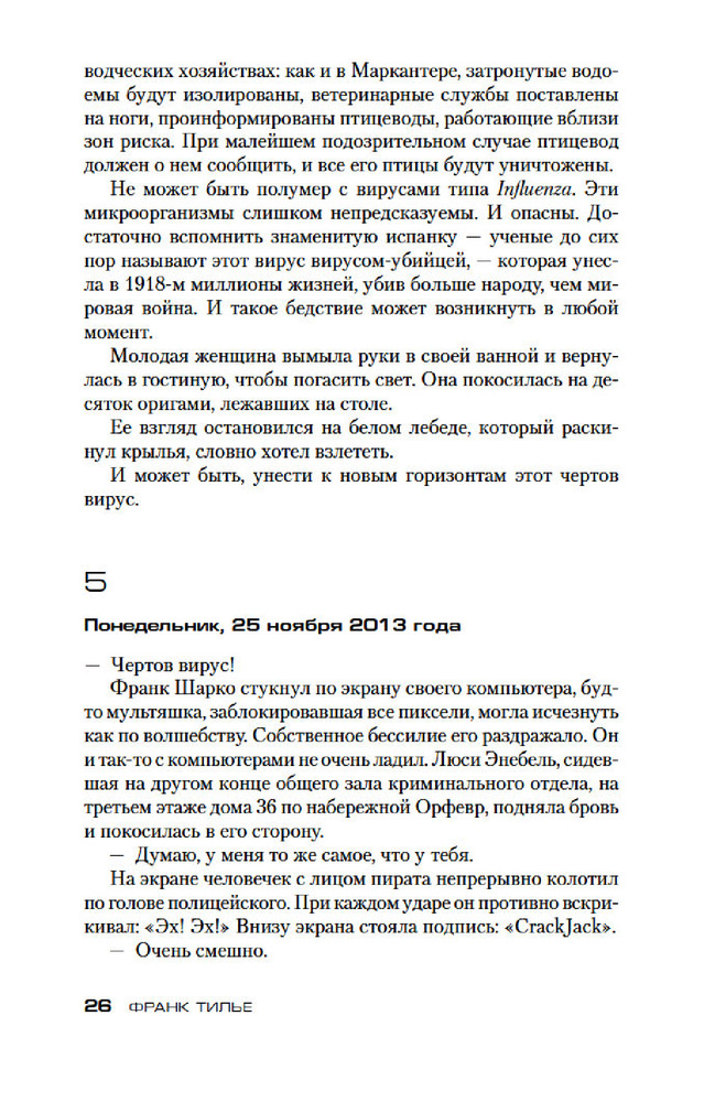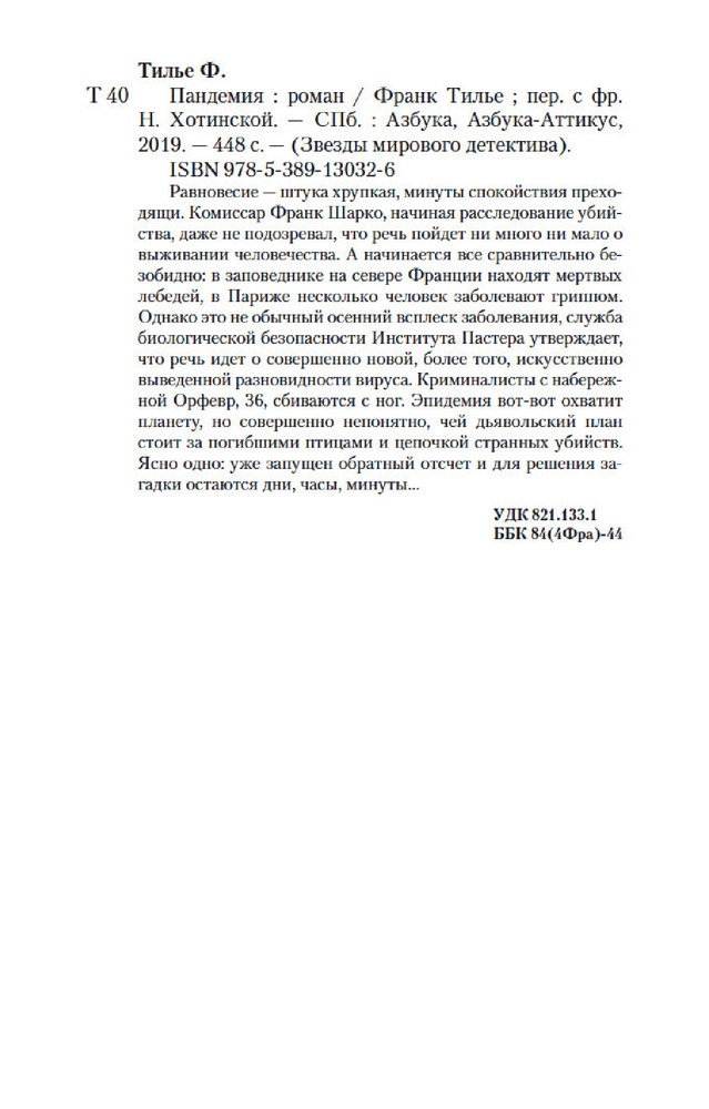 💳 Оплатить за товар можно при получении 🇰🇿 Есть бесплатная доставка по Казахстану от 1 дня 🎁 Копите бонусы с каждой покупки Серия: Звезды мирового детектива (обложка) Равновесие штука хрупкая, минуты спокойствия преходящи. Комиссар Франк Шарко, начиная расследование убийства, даже не подозревал, что речь пойдет ни много ни мало о выживании человечества. А начинается все сравнительно безобидно: в заповеднике на севере Франции находят мертвых лебедей, в Париже несколько человек заболевают гриппом. Однако это не обычный осенний всплеск заболевания, служба биологической безопасности Института Пастера утверждает, что речь идет о совершенно новой, более того, искусственно выведенной разновидности вируса. Криминалисты с набережной Орфевр, 36, сбиваются с ног. Эпидемия вот-вот охватит планету, но совершенно непонятно, чей дьявольский план стоит за погибшими птицами и цепочкой странных убийств. Ясно одно: уже запущен обратный отсчет, и для решения загадки остаются дни, часы, минуты... |