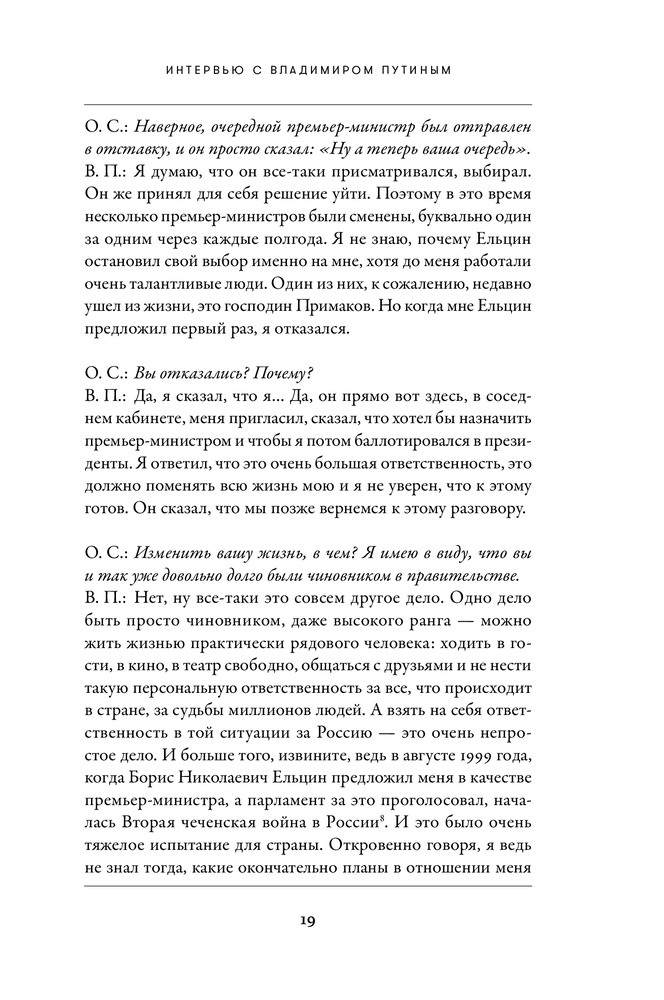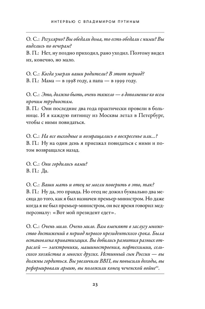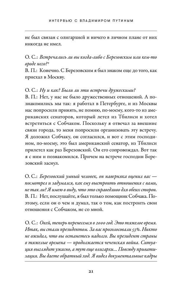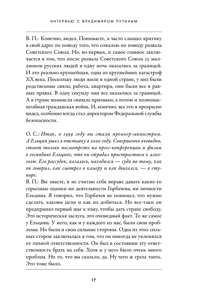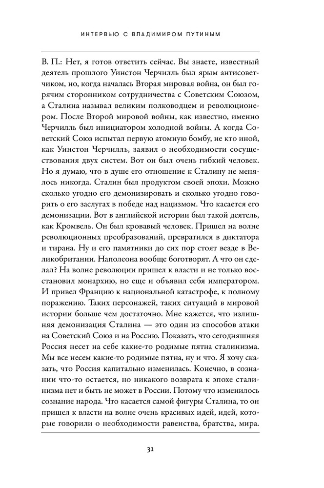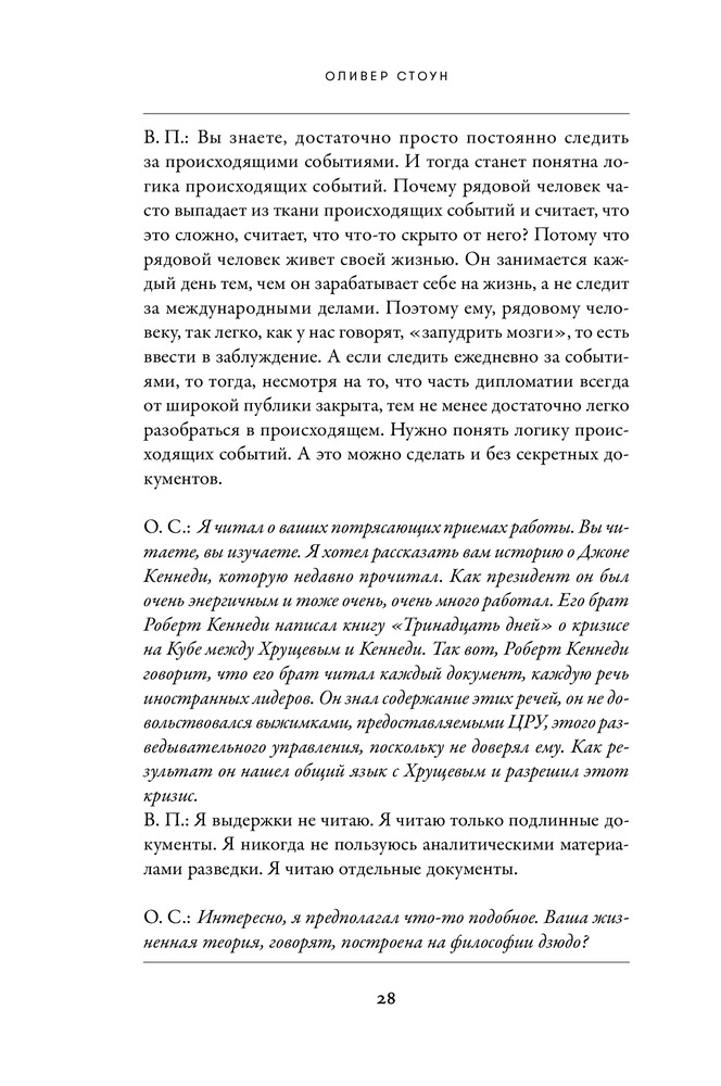 В целом, интересное интервью. В книге акцент делается в основном на американско-российские отношения, а если точнее, то обсуждают почти только мнение США на те или иные действия России, и наоборот. Естественно, что там нет углубленных пояснений на поднятые темы, в целом, для общего понимания достаточно. И кстати ответы показались субъективными и слишком политкорректными). Для человека, не вникающего в вопросы, отраженные в книге, разговор будет не совсем понятный. Качество книги хорошее, даже отличное. Красивая обложка. Наткнулся на грубую грамматическую ошибку, которая испортила первое впечатление. Ошибка только одна, остальные мелкие и незаметные. Но в целом, книга мне понравилась. И спасибо Флипу в тысячный раз!