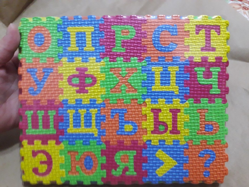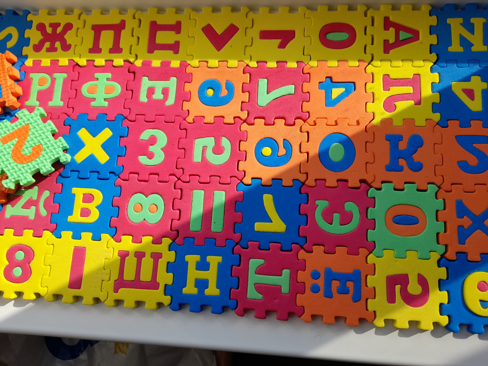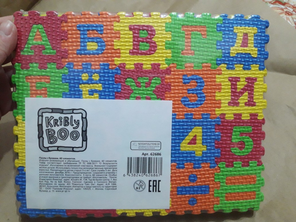 Отличная мозайка, малыши в восторге, только небольшая не точность: в упаковке 60 элементов буквы и цифры, получился не полный алфавит.