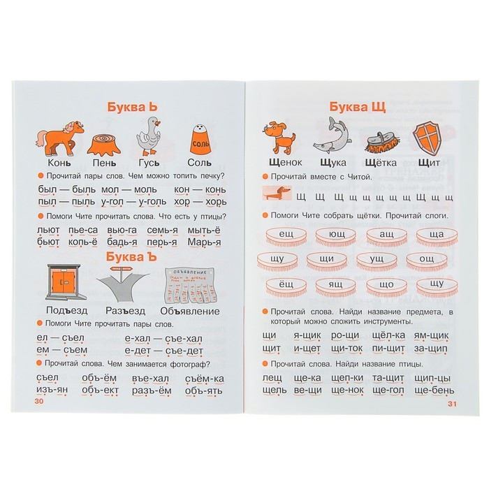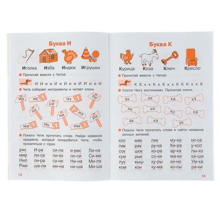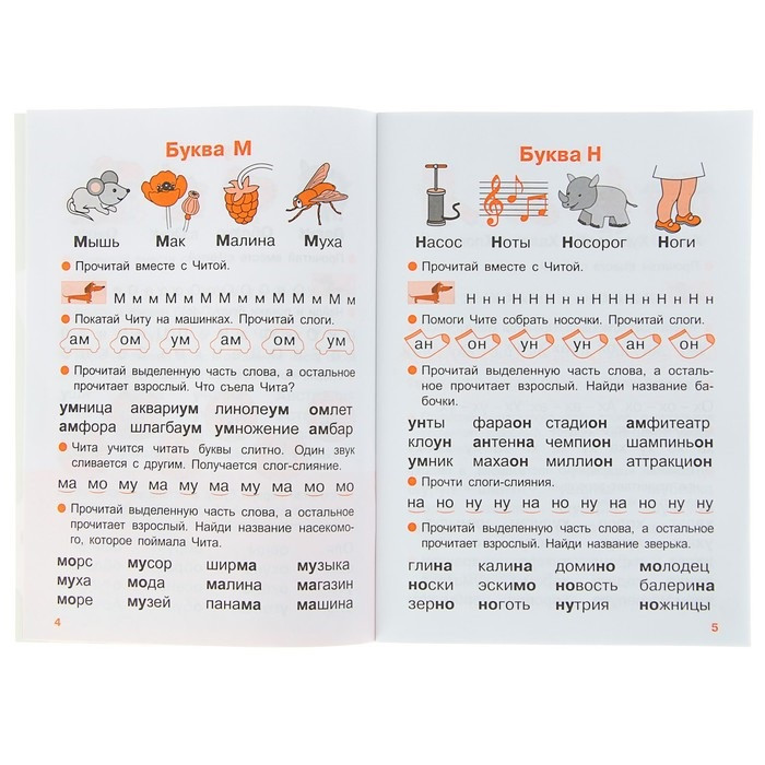 Материал в тренажёре подаётся в порядке возрастающей сложности, поэтому все задания следует выполнять последовательно. Название каждой буквы произносите как звук (например, не «эр», а «р»). Учите ребёнка читать обратные слоги (гласный-согласный звуки) и слоги-слияния (согласный + гласный звуки). Слоги-слияния обозначены в пособии дугами, согласный без последующего гласного обозначен точкой, а гласный без предшествующего согласного — чёрточкой. Прочитывайте вместе с ребёнком слоги целиком (например, «ма»). Объясните, что звуки в слогах-слияниях сливаются. Не называйте отдельные буквы (это — «м», а это — «а», вместе будет — «ма»), иначе ребёнок долго будет прибегать к побуквенному чтению. Повторяйте несколько раз прочитанный слог или слово.